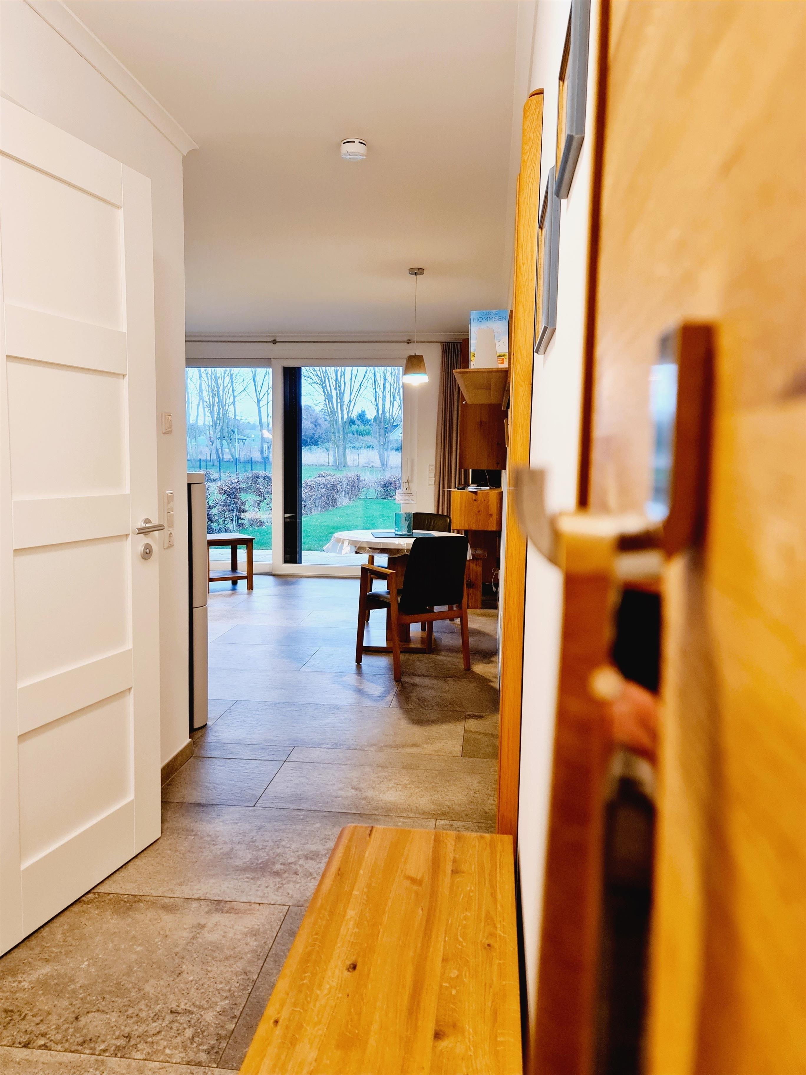 "Strandgut" ? ein komfortables Ferienappartement mit einem großzügigen Wohnbereich und offener Einbauküche, komplett ausgestattet - Einbauherd, Mikrowelle, Kühlschrank und Gefrierfächern. In dem nach Osten ausgerichteten Schlafzimmer ist ausreichend Stauraum im Einbauschrank gegeben. Im Bad finden Sie eine bodengleiche Ganzglasdusche, ein Einbaubecken in der Granitwaschtischplatte und einen elektrischen Badheizkörper vor. Fußbodenheizung per Erdwärme, Einbauküche, hölzern und bequem möbliert. Überdachte Terrasse und eigene Liegewiese mit weitem Seeblick.