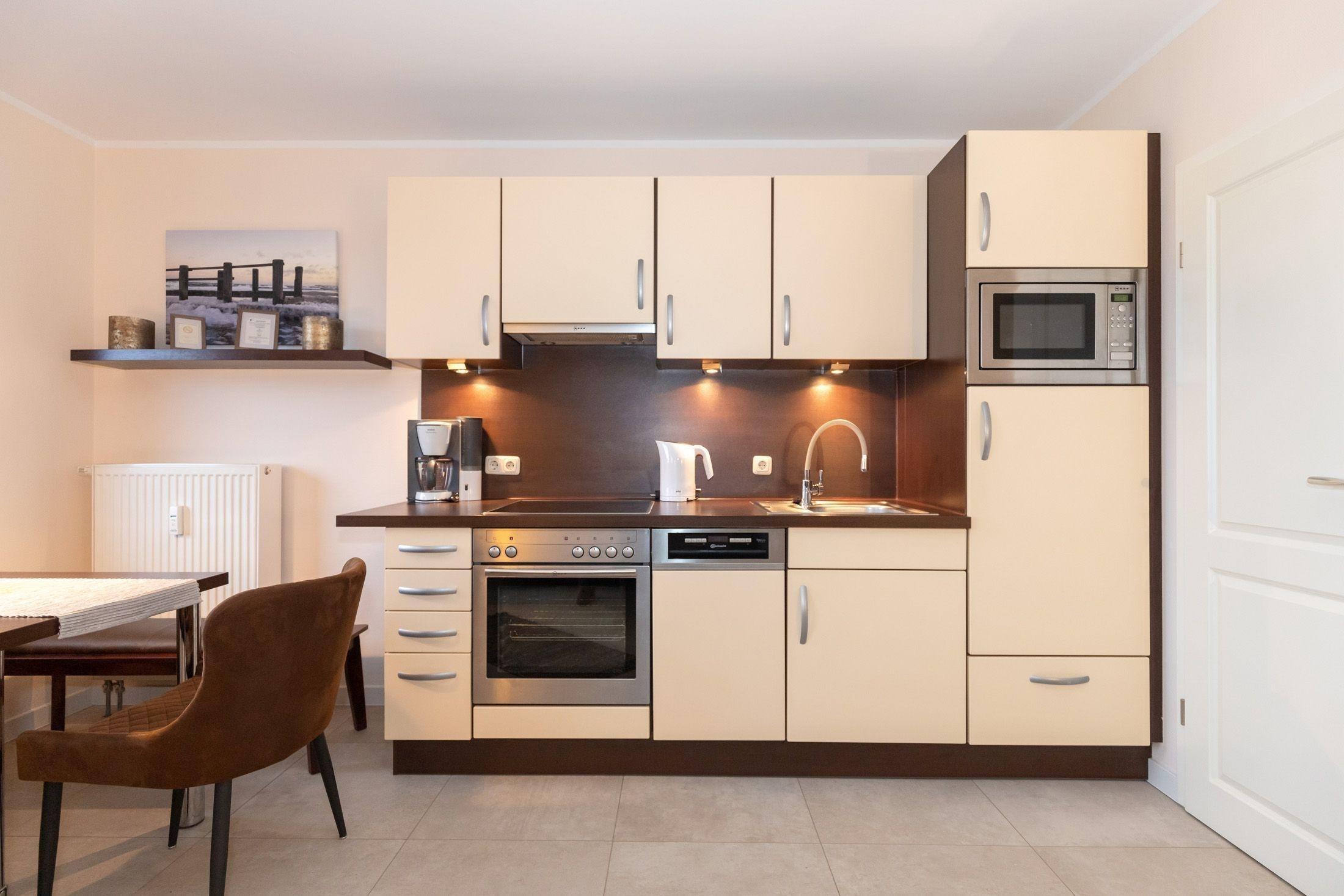 Die offene und voll ausgestattete Küche grenzt direkt an den Wohnbereich. Hier finden Sie alles, vom Besteck über Geschirr bis hin zu diversen Küchenutensilien. Natürlich ist auch eine Kaffeemaschine, ein Toaster, Wasserkocher, Cerankochfeld, Backofen, Kühlschrank und Geschirrspüler vorhanden.