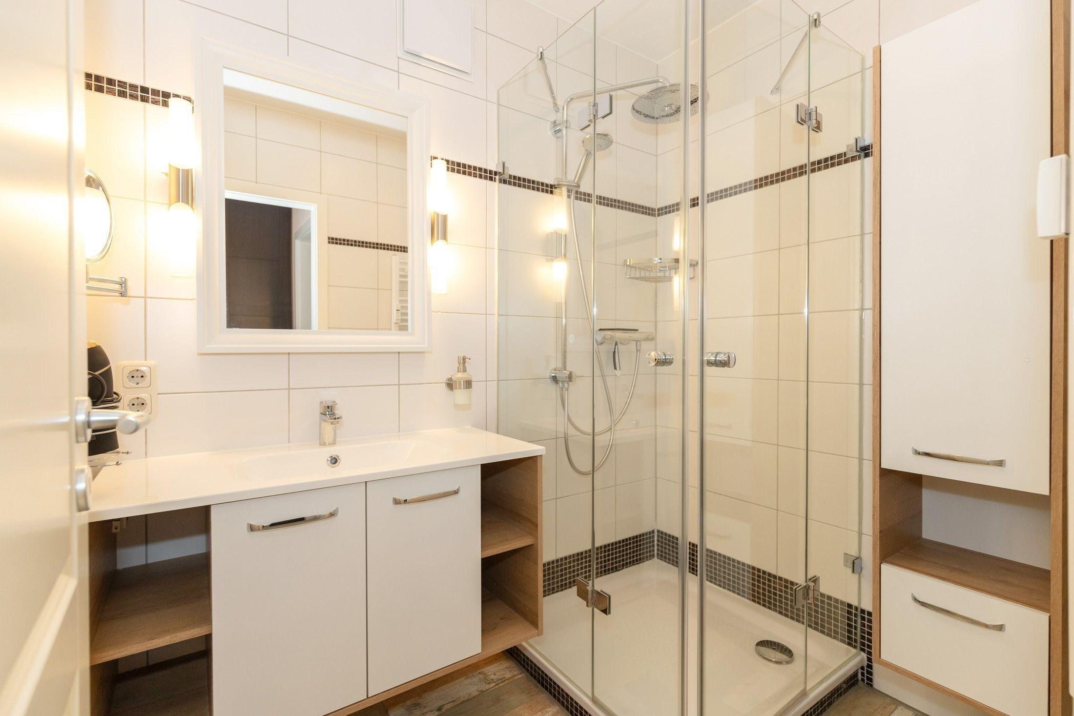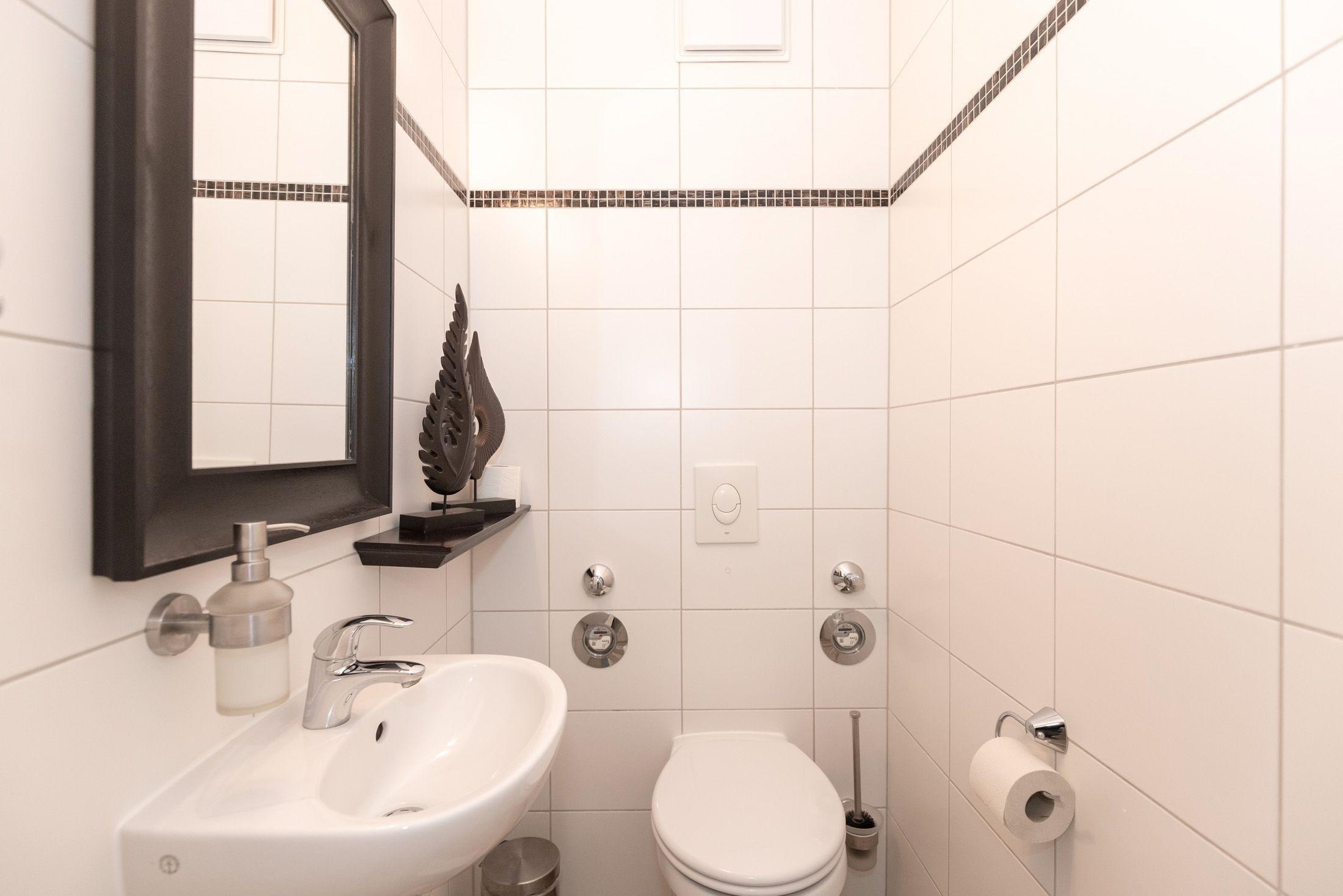 Die Wohnung verfügt über ein Badezimmer mit Dusche. Damit sich niemand in die Quere kommt, ist ein separates WC mit einem 2ten Waschbecken vorhanden.