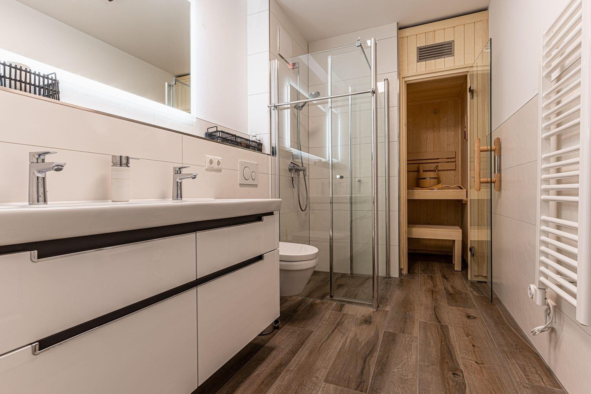 Das Bad verfügt über eine begehbare Dusche. Ein moderner Waschtisch mit genügend Ablagemöglichkeiten für Ihre Utensilien, ein großer Spiegel und ein Föhn sind vorhanden. Ein Highlight ist Ihre private Sauna, welche Sie uneingeschränkt nutzen können.