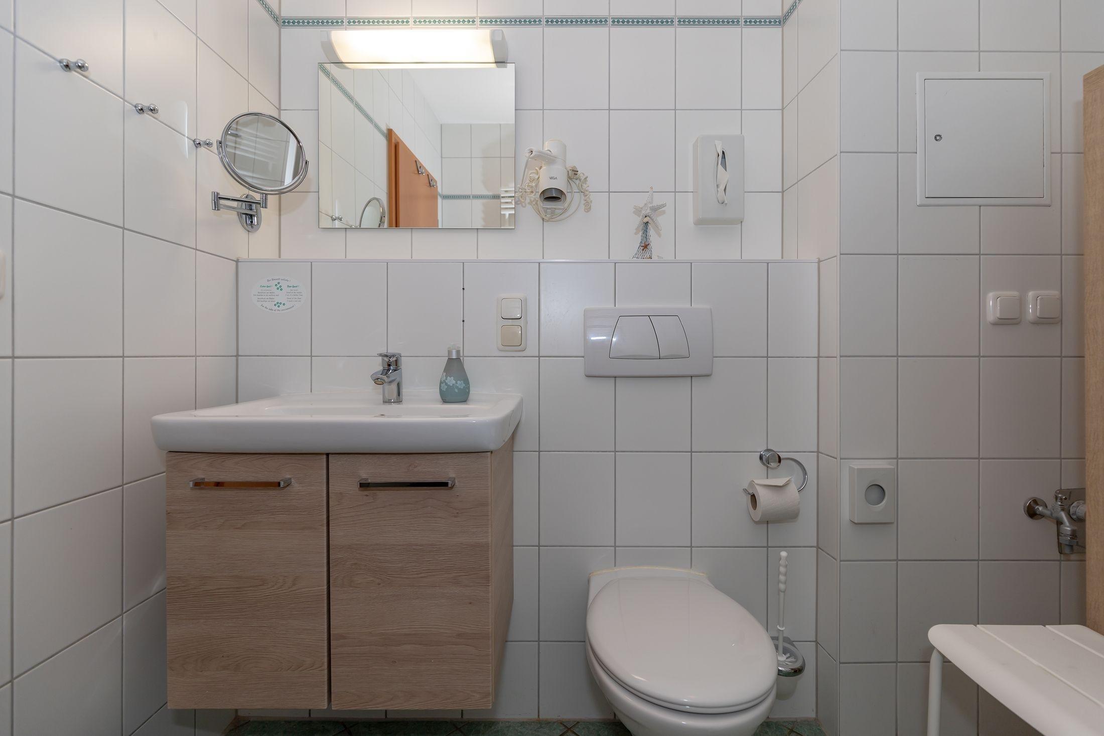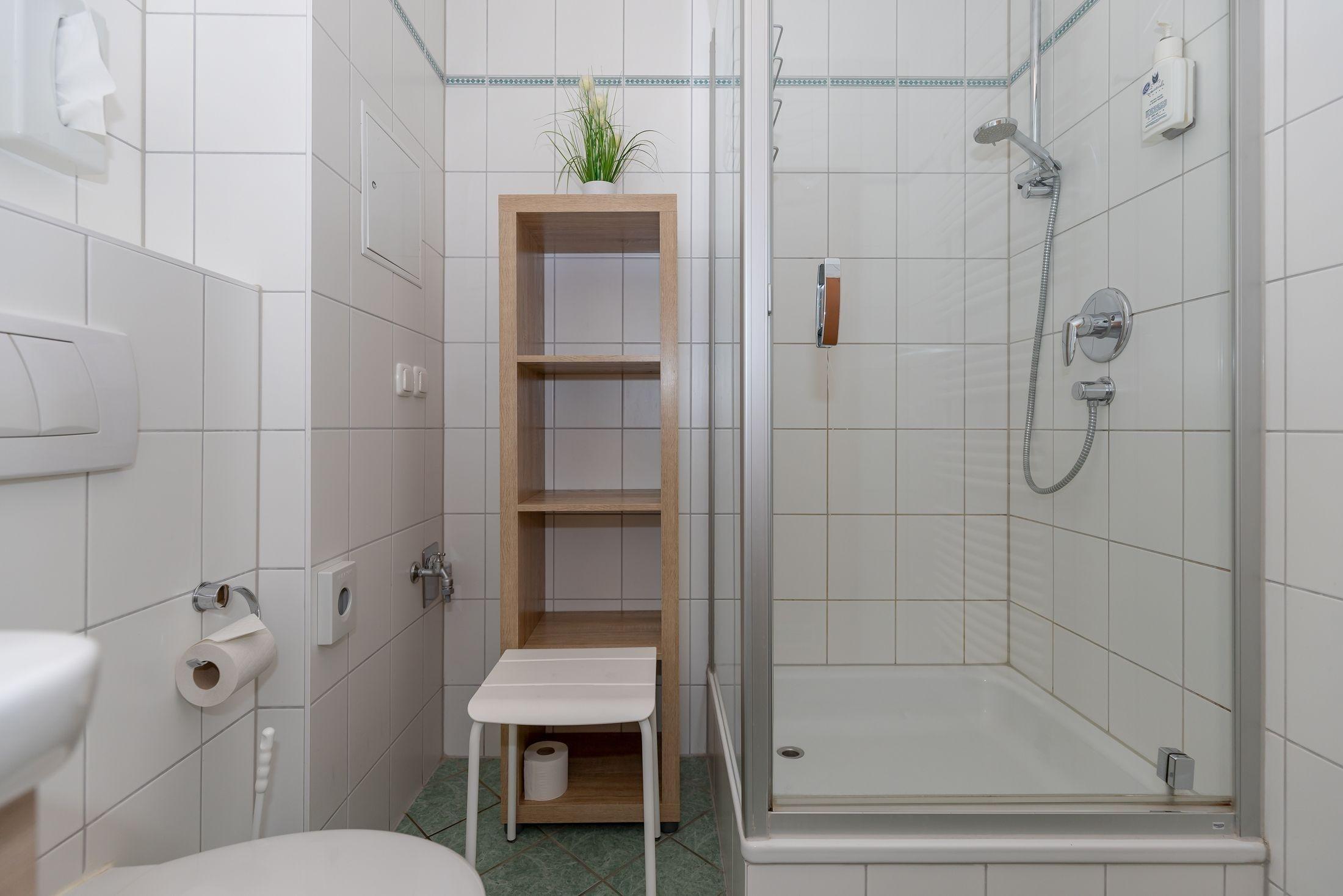 Das Badezimmer verfügt über eine Dusche, ein WC, einen Waschtisch sowie einen Handtuchheizkörper. Ausreichend Platz für Ihre Badutensilien ist ebenfalls vorhanden, ebenso ein Föhn und ein Kosmetikspiegel.