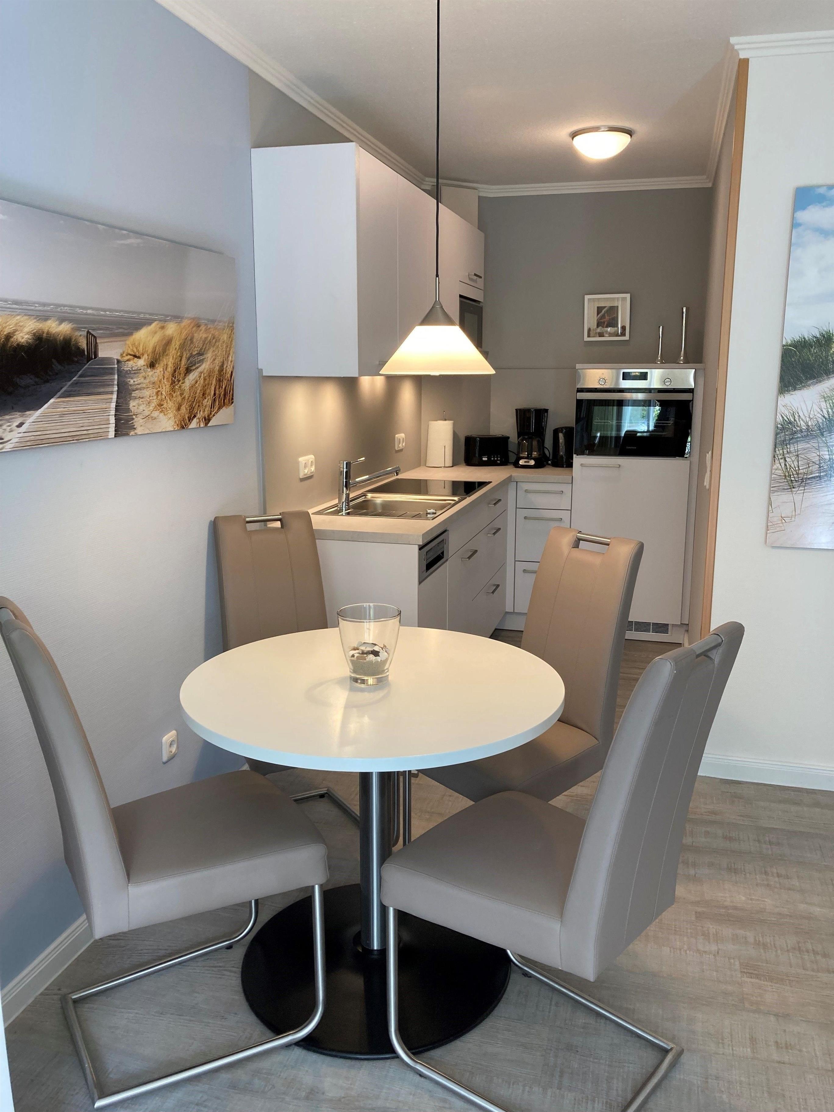 Der Esstisch mit 4 Stühlen sorgt für den charmanten Übergang zum Wohnzimmer. Hier werden die gemeinsamen Mahlzeiten angerichtet oder auch fröhliche Spielabende veranstaltet.