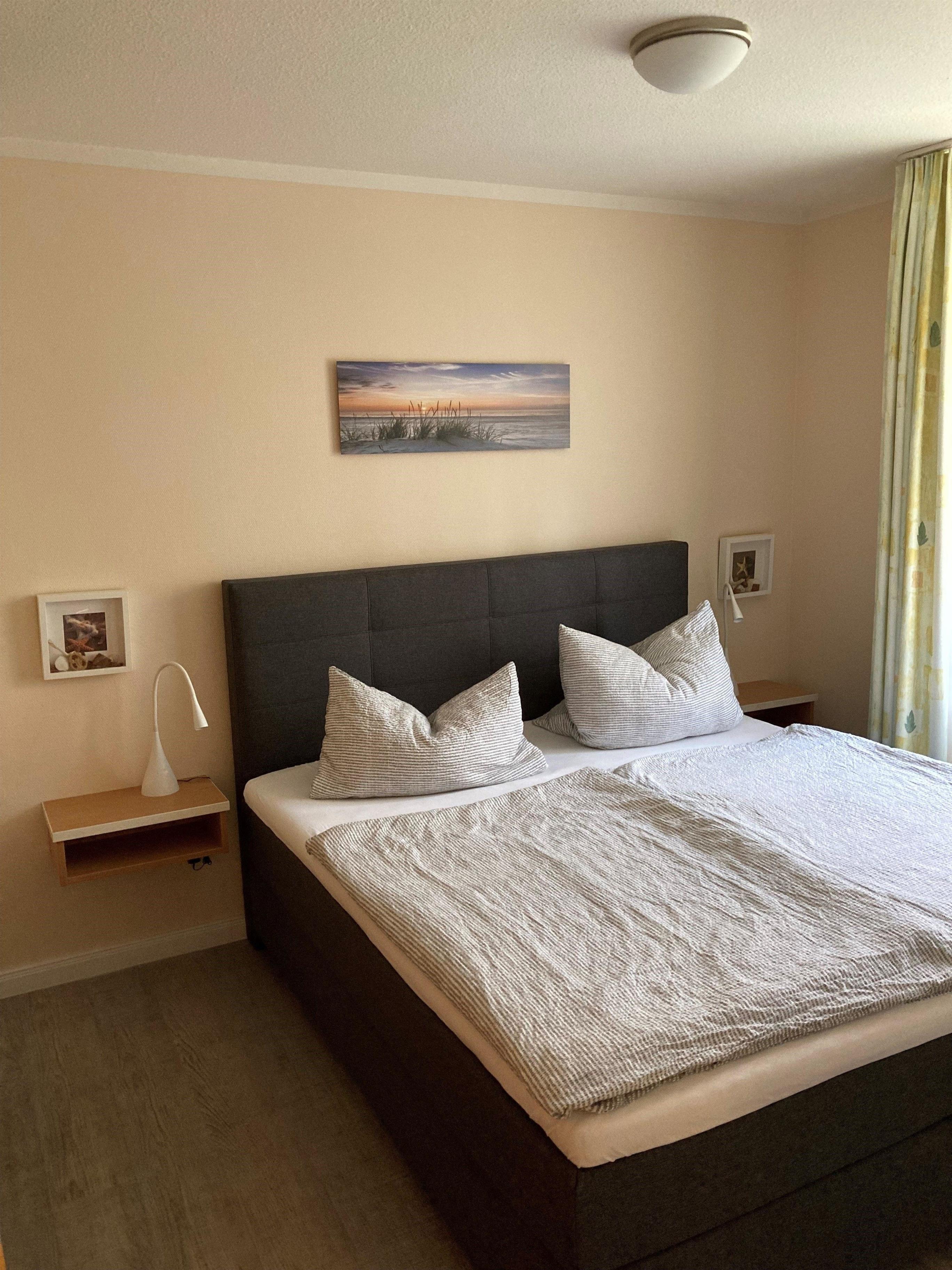 Das helle Schlafzimmer ist mit einem großen Boxspring-Bett (1,80 x 2,00 m) eingerichtet, auf dem Sie nach einem ereignisreichen Urlaubstag einen erholsamen Schlaf finden. Ihre Urlaubsgarderobe können Sie bequem im geräumigen Kleiderschrank verstauen.