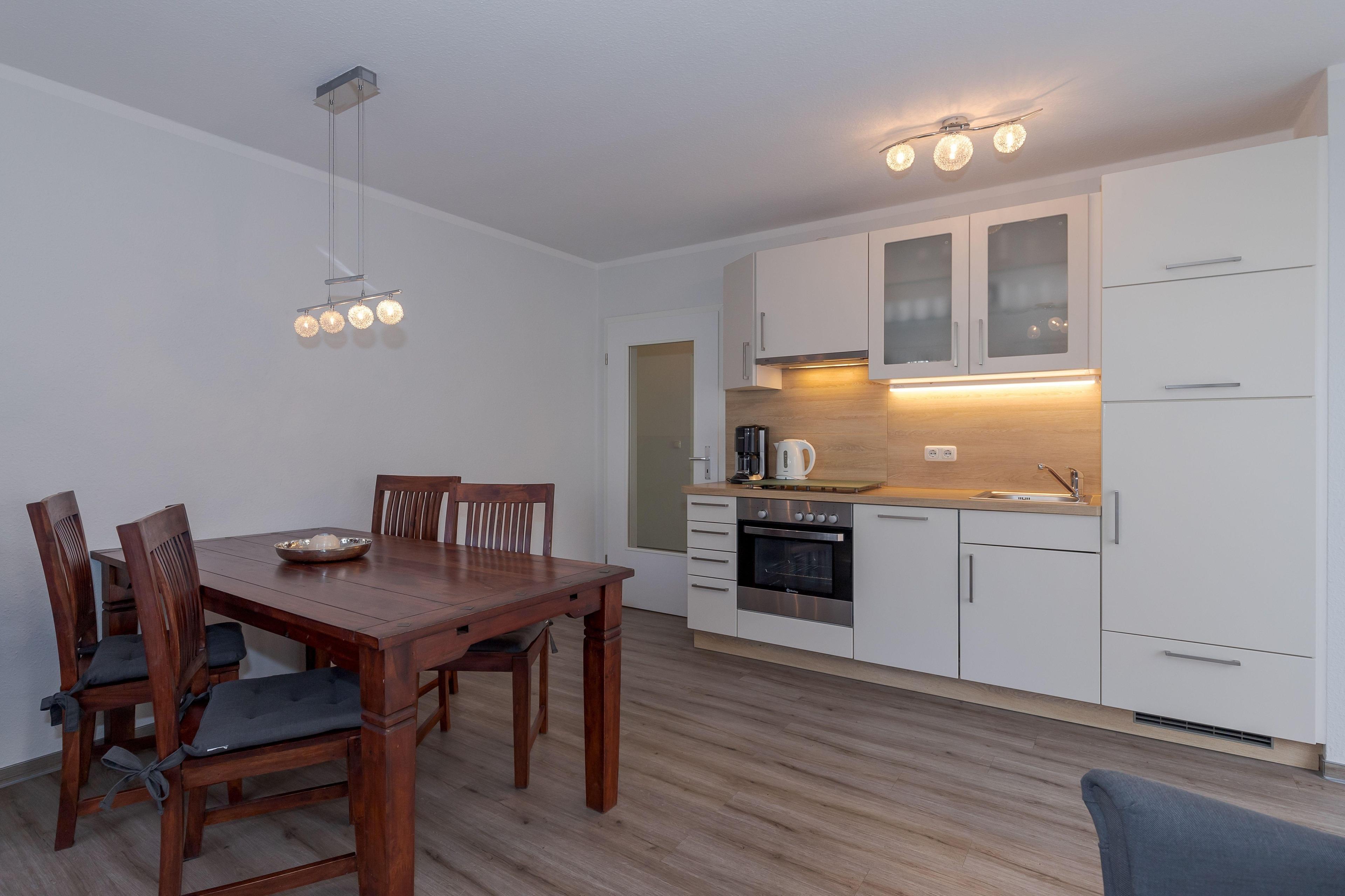 An das Wohnzimmer grenzt der Esstisch, an dem alle Familienmitglieder ihren Platz finden. In diesem Bereich befindet sich die voll ausgestattete Küche, hier müssen Sie für die Zubereitung Ihrer Mahlzeiten auf nichts verzichten.