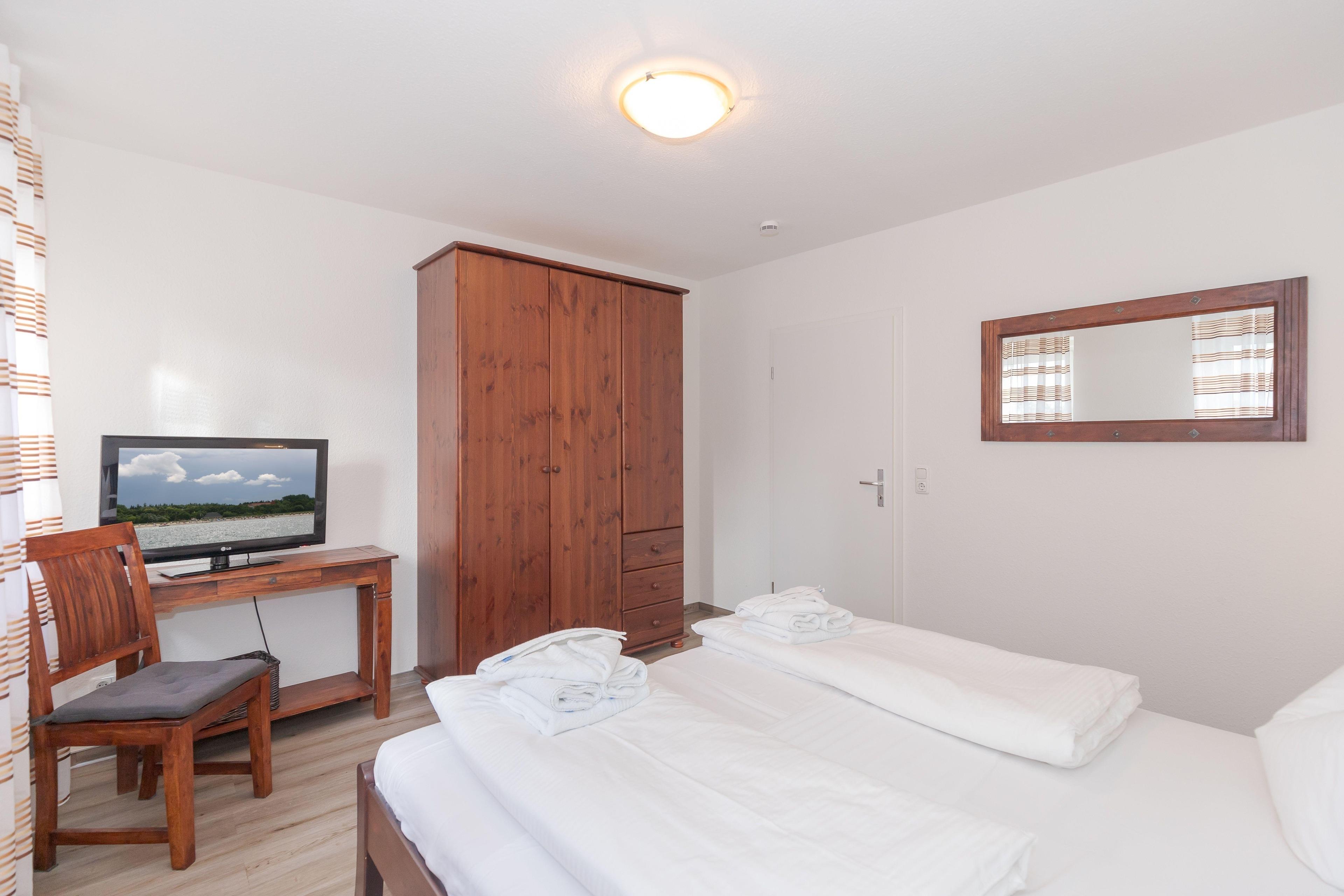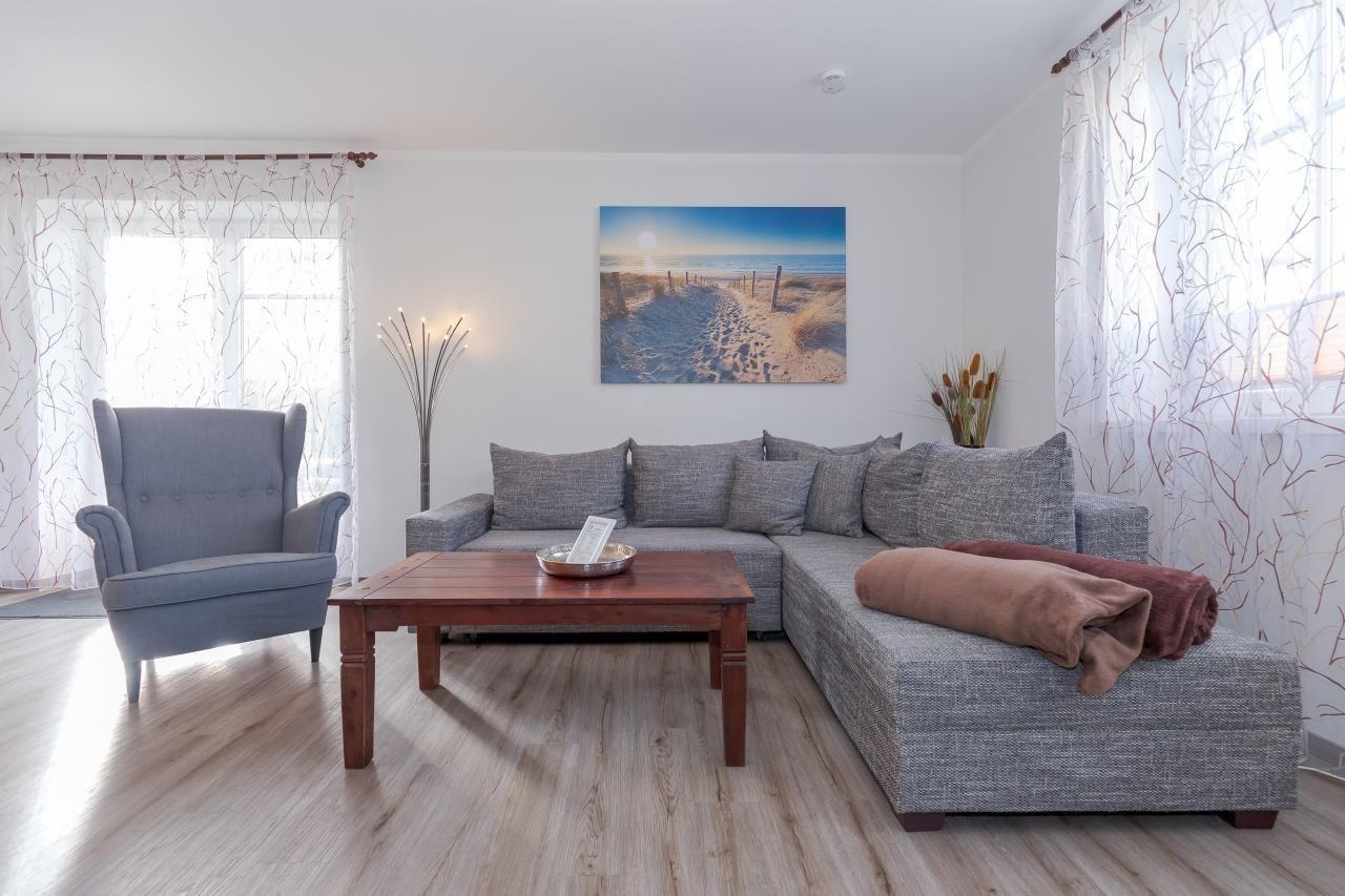 Die helle 3-Zimmer-Wohnung für bis zu 5 Personen befindet sich im Erdgeschoss und ist zur Südseite gelegen. Sie wurde mit dunklen, im rötlichen Ton gehaltenen Möbeln ausgestattet. Des Weiteren wurde hochwertiges Laminat in der gesamten Wohnung verlegt.