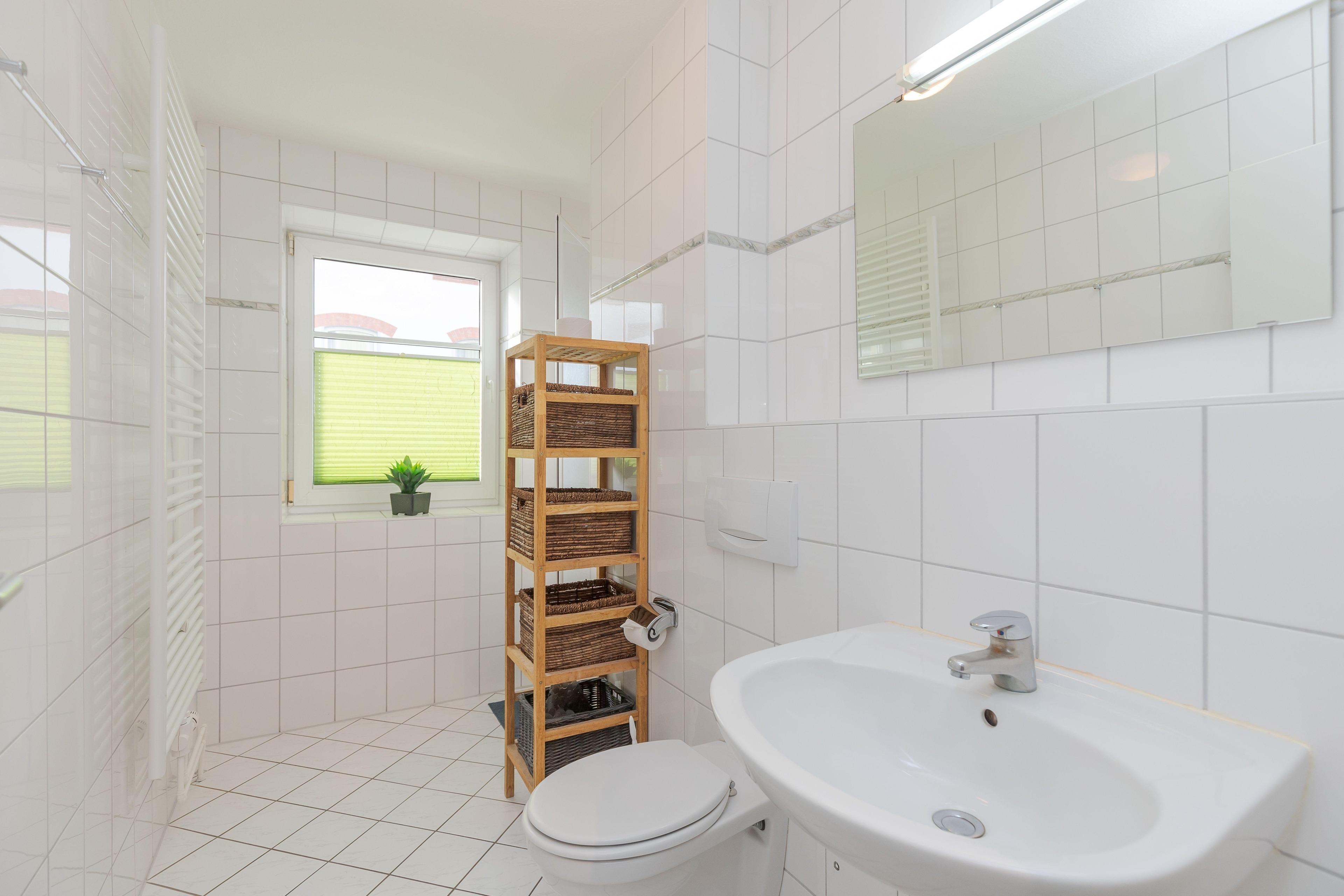 Das Badezimmer ist mit einer Dusche, einem Waschbecken, einem Handtuchheizkörper und einem WC ausgestattet.