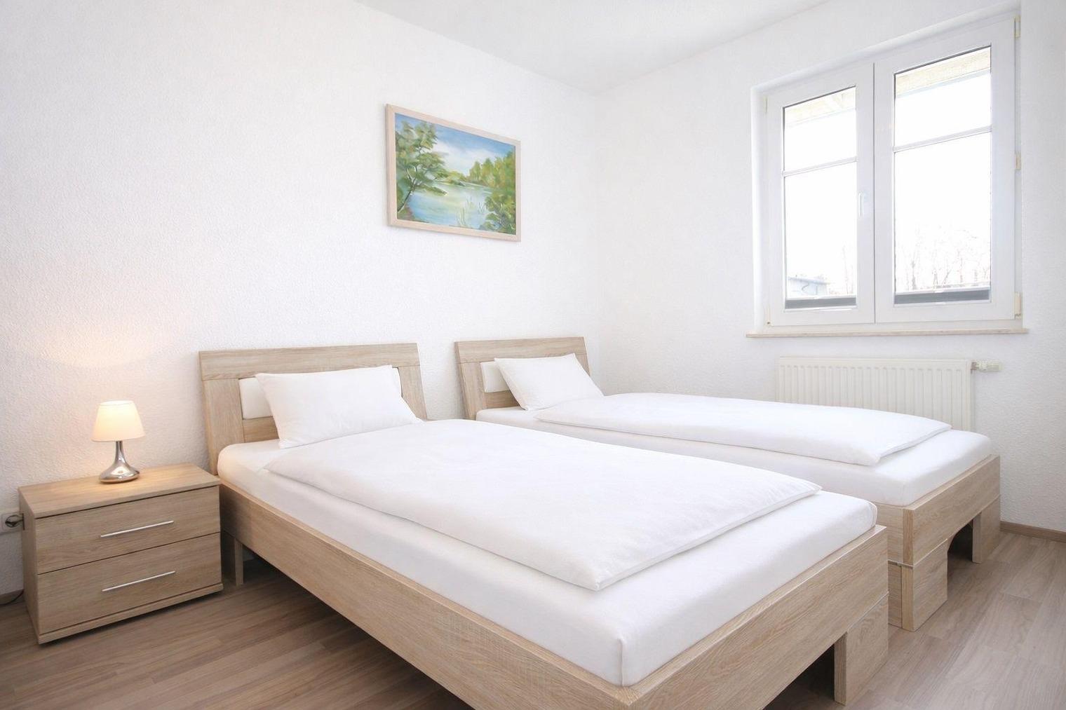 Das zweite Schlafzimmer verfügt über zwei Einzelbetten und ebenfalls einen großen Kleiderschrank.
