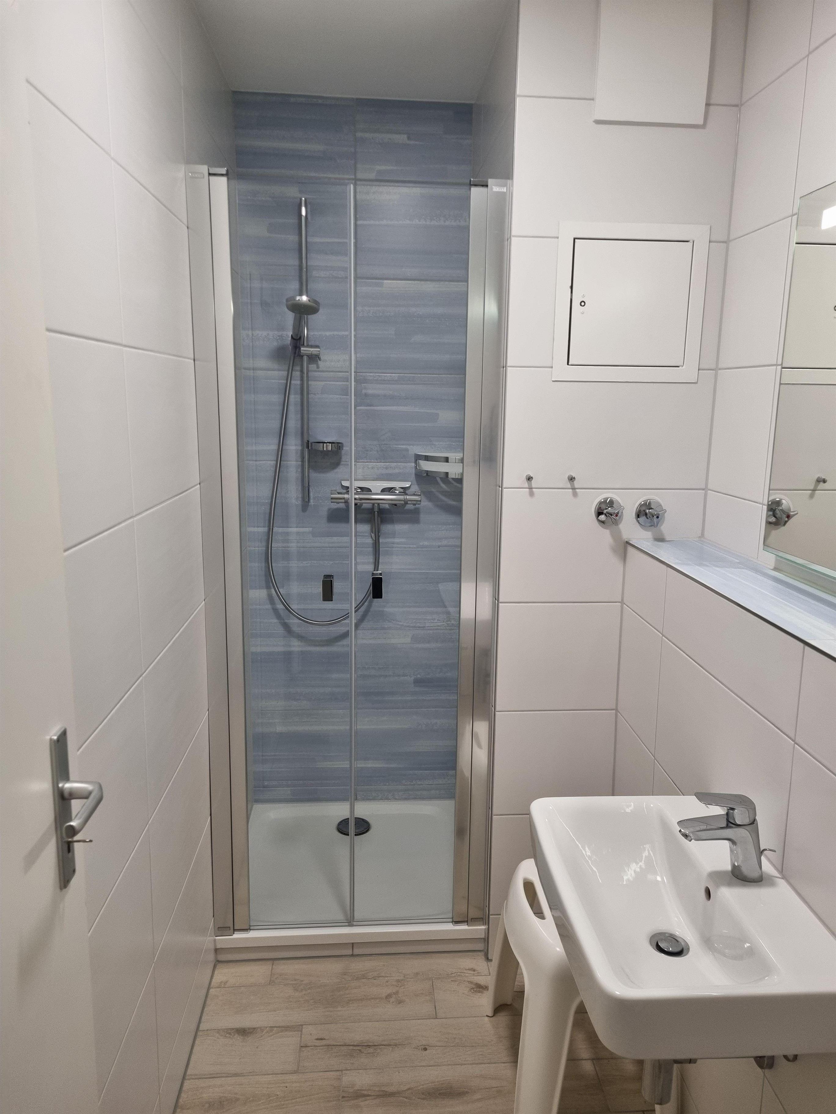 Das Badezimmer ist ausgestattet mit einer Dusche, einem WC, einem Waschbecken sowie ausreichend Ablageflächen für Ihre Badutensilien.