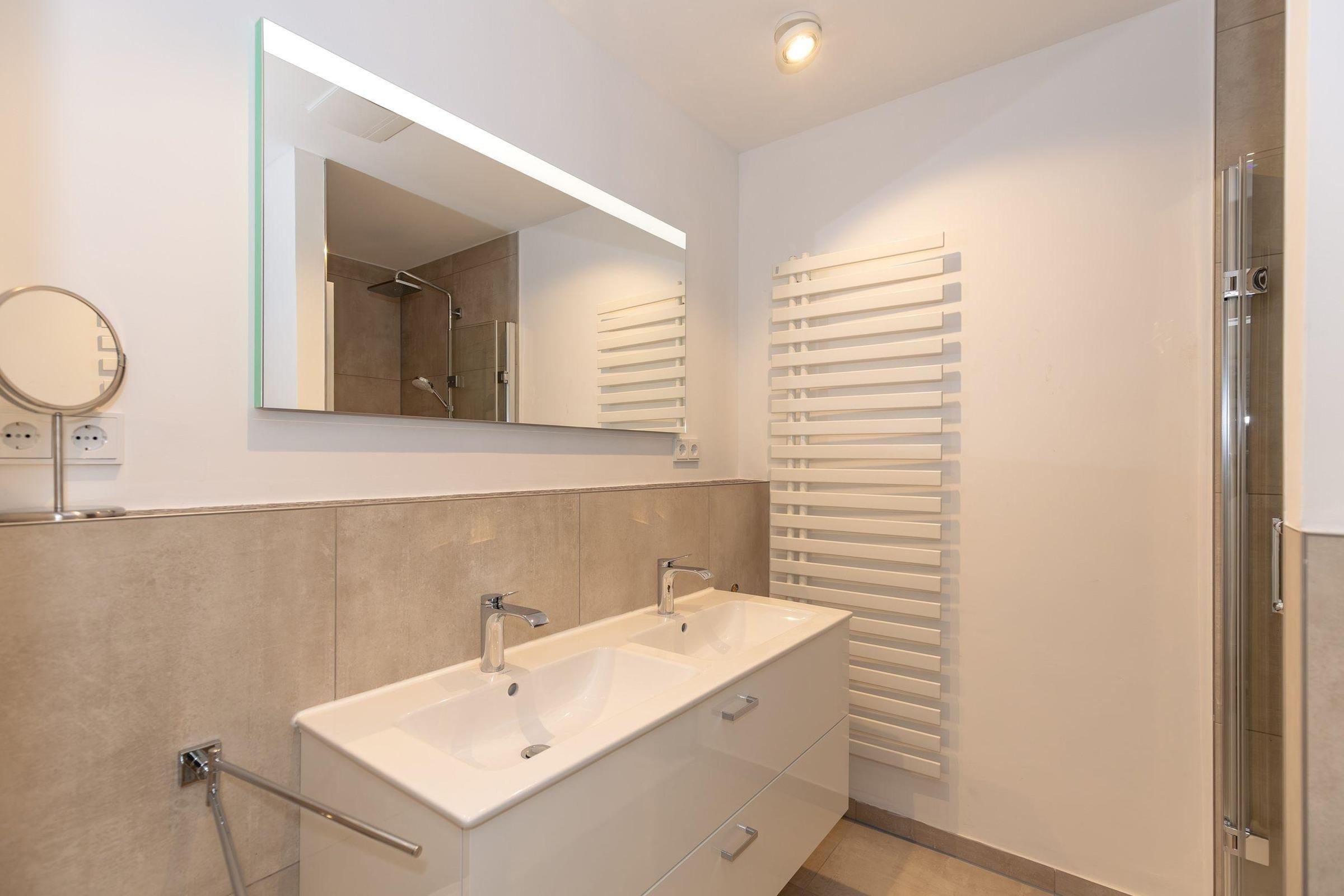 Das Badezimmer verfügt über eine geräumige Dusche, ein WC, einen Handtuchheizkörper und einen Waschtisch mit Doppelwaschbecken mit ausreichend Stauraum für Ihre Badutensilien.