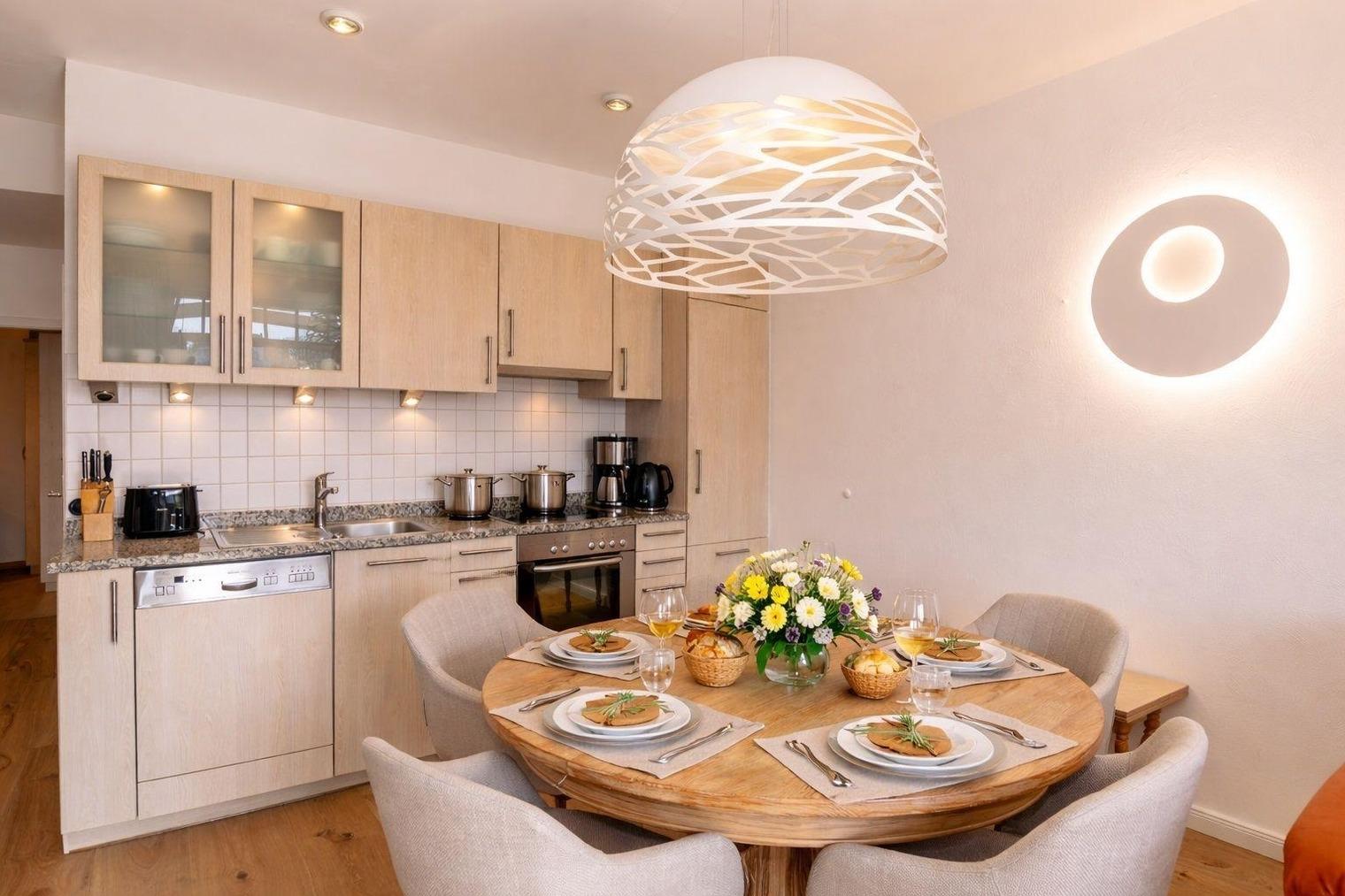 In der angrenzenden, voll ausgestatteten Küchenzeile lassen sich Ihre Lieblingsgerichte einfach zubereiten.