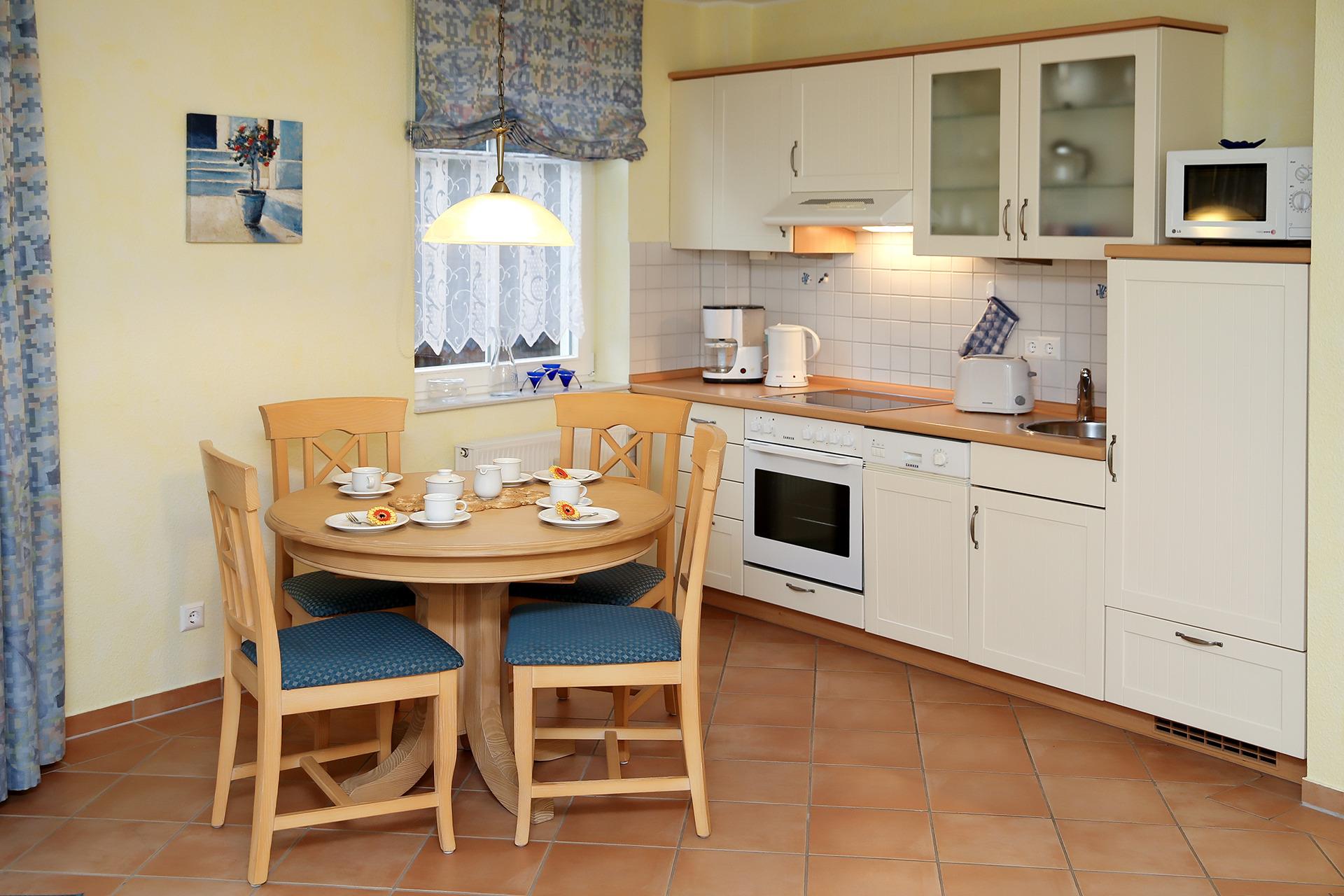 Zusätzlich finden Sie im Wohnbereich eine Sitzgruppe mit Esstisch. Die moderne Küche ist mit einem Geschirrspüler, Mikrowelle sowie einem Backofen ausgestattet.