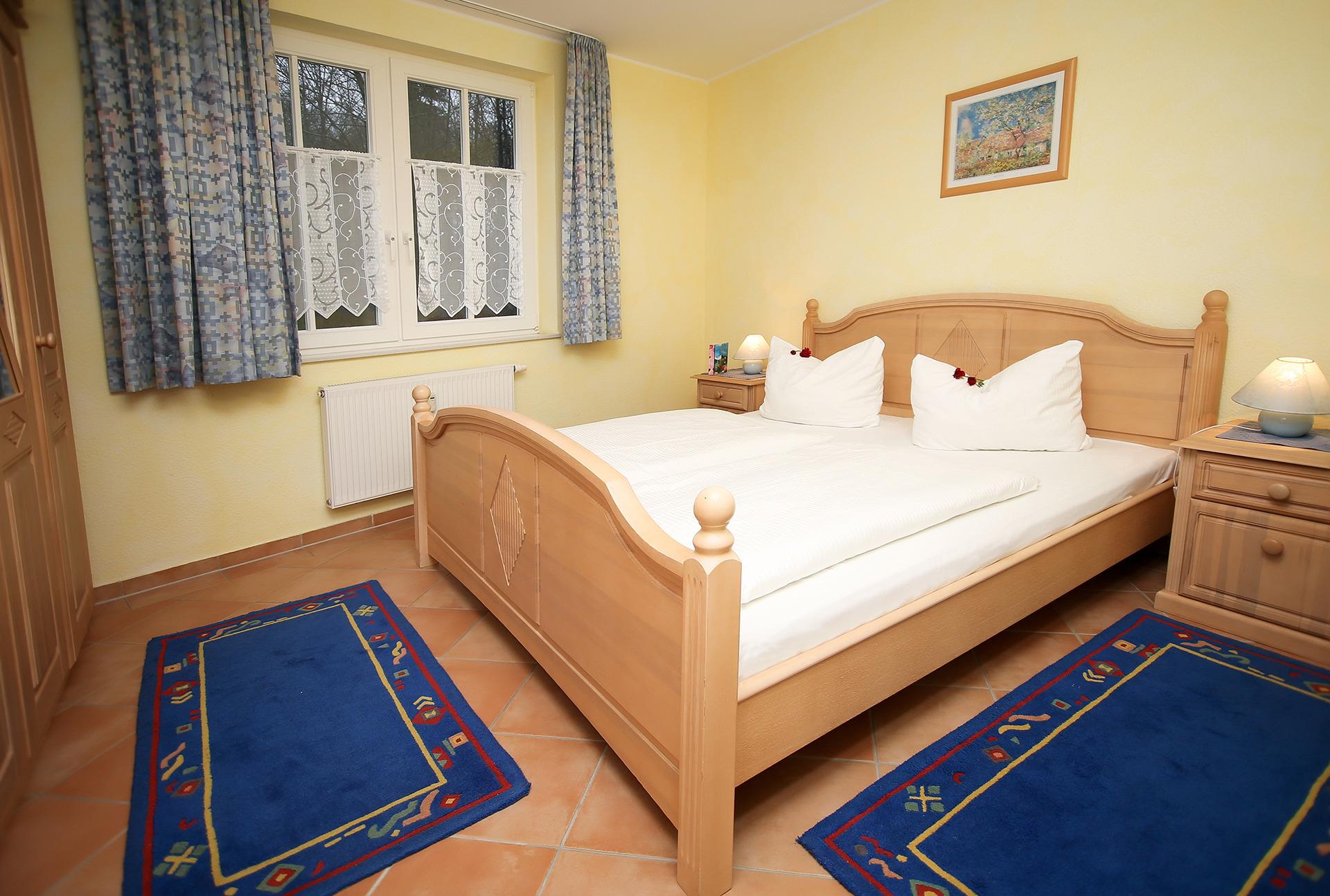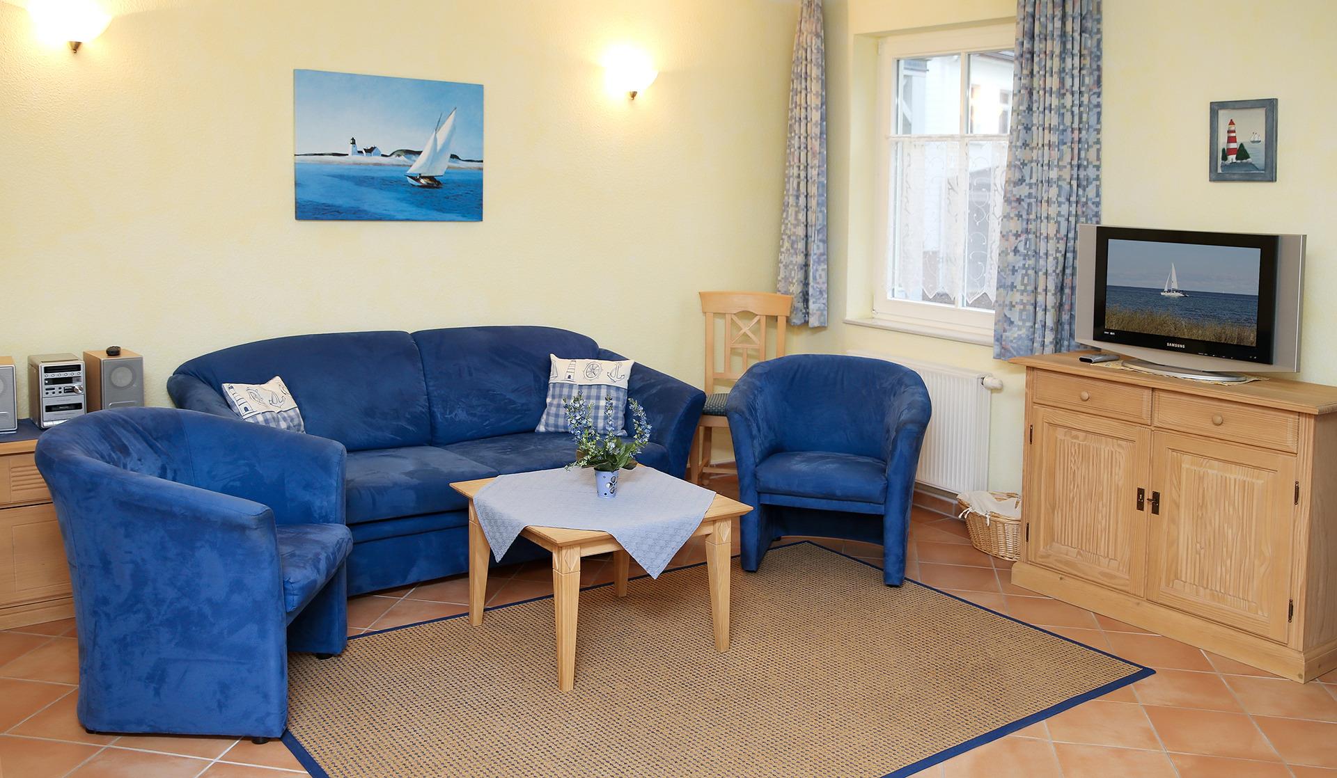 eingerichtet. Ein Schlafzimmer mit Doppelbett und eine Schlafcouch im Wohnbereich stellen die Schlafmöglichkeiten.