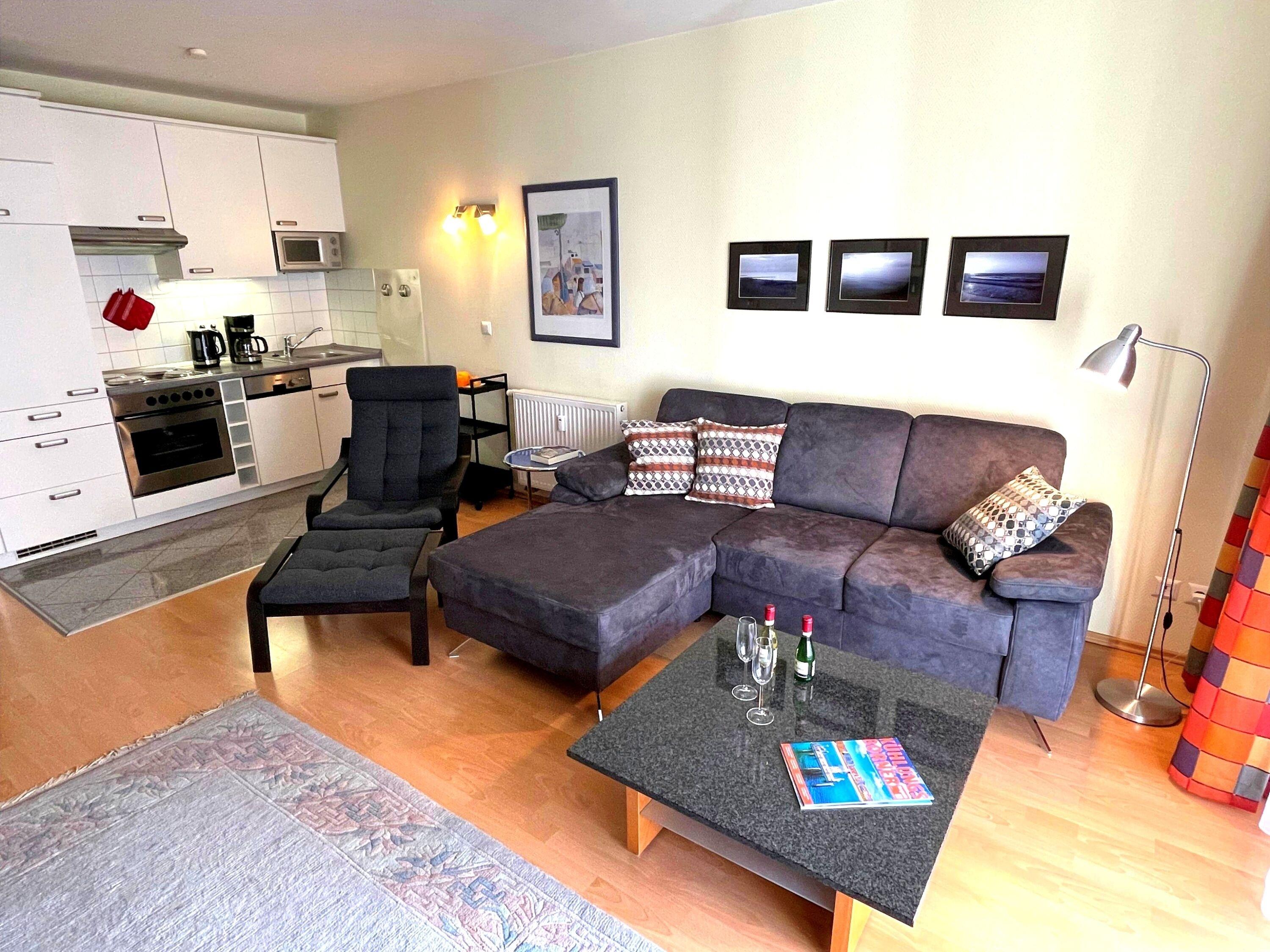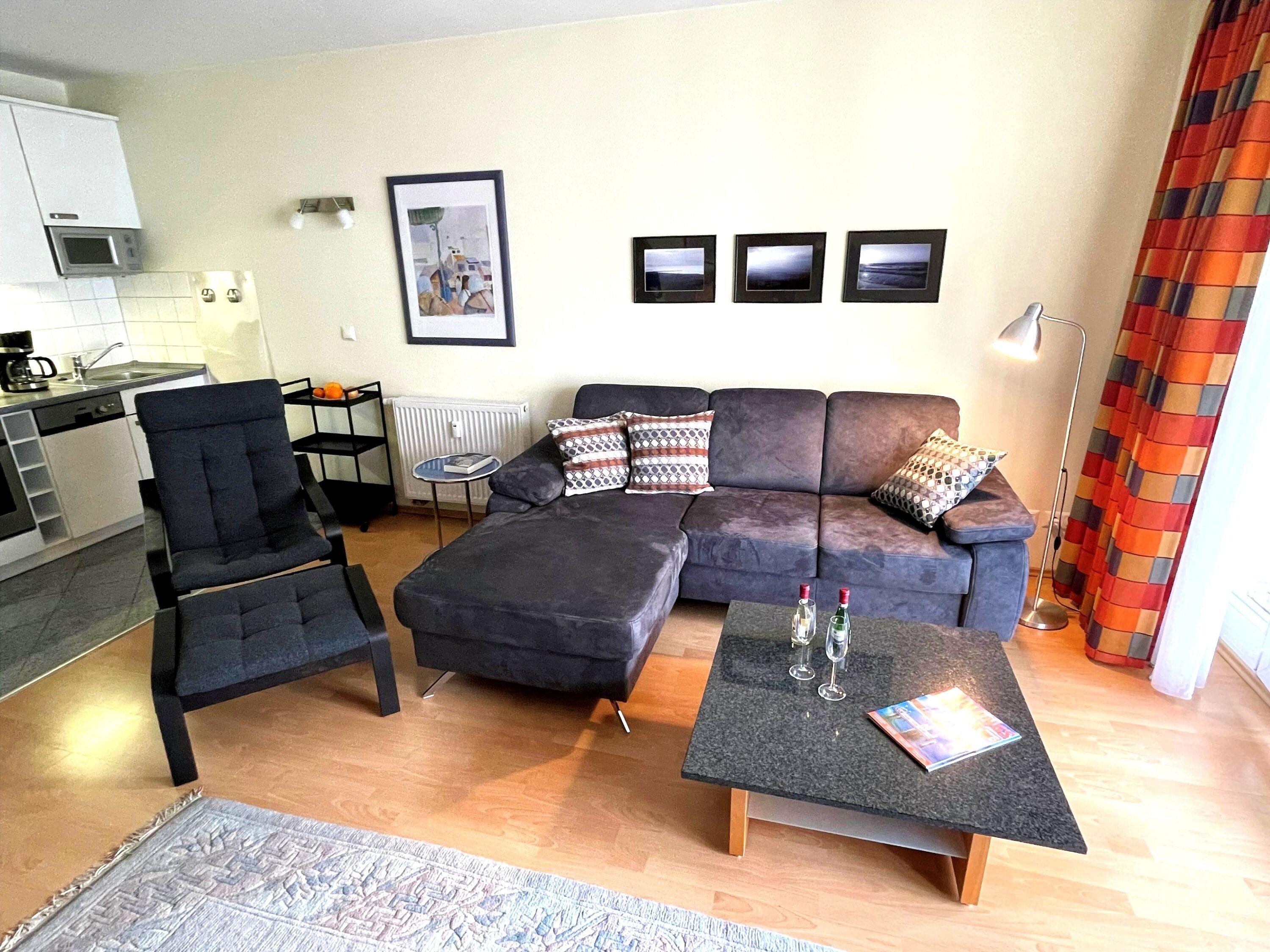 Die moderne, großzügig geschnittene 3-Zimmer-Fewo befindet sich im 1. Obergeschoss, ist ca. 61 m² groß und für bis zu 4 Personen eingerichtet.