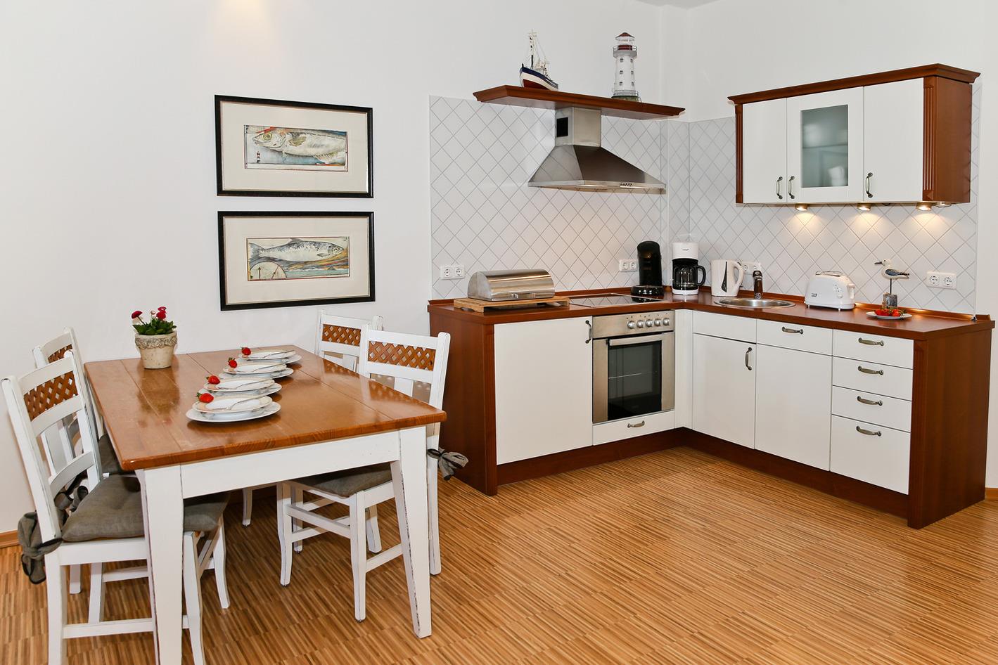 Die komfortable Küche mit 4-Platten-Ceranfeld, Backofen, Mikrowelle und Geschirrspüler ist im Wohnbereich integriert.