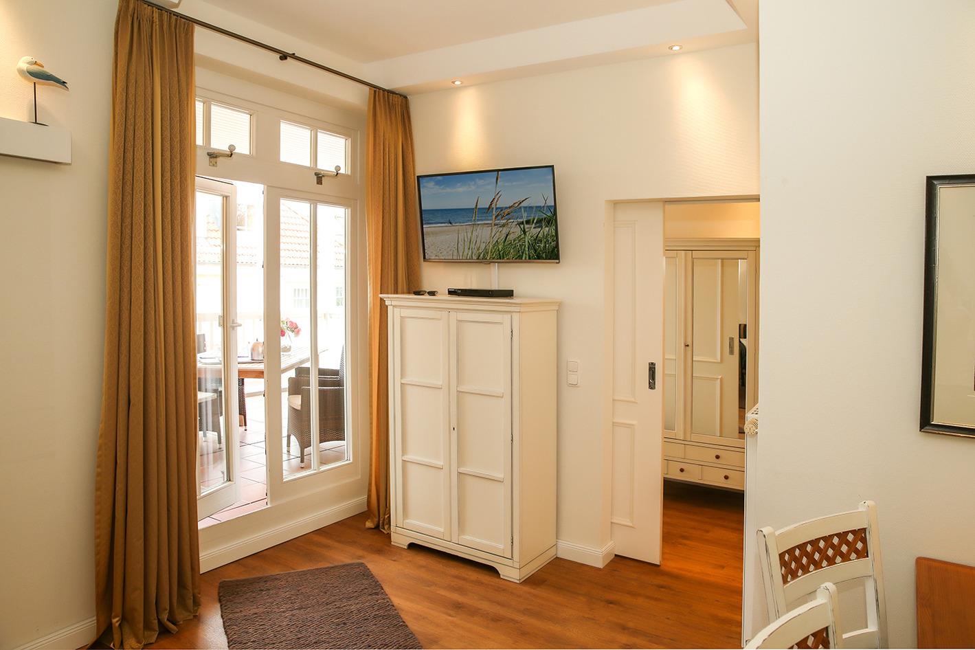 Das zweite Schlafzimmer ist vom Wohnraum durch eine zweiflügelige Schiebetür getrennt und mit zwei Einzelbetten möbliert. Bei Bedarf kann dieser Raum durch das Öffnen der Schiebetür in den Wohnraum integriert werden.