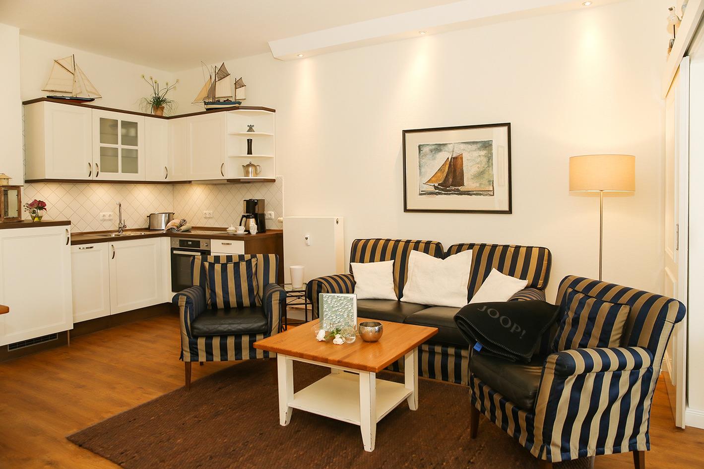 Das Wohn-und Esszimmer ist großzügig geschnitten, mit einer L-förmigen vollwertigen Küche (incl. Geschirrspülmaschine), einem Esstisch mit vier Stühlen sowie einer Sitzgruppe, bestehend aus Couch und zwei Sesseln, möbliert.