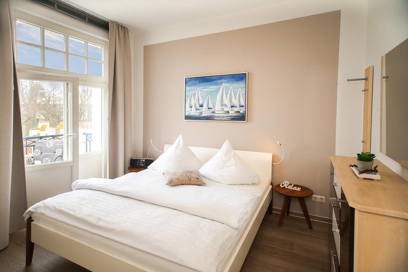 Den Balkon können Sie vom Wohnbereich als auch vom Schlafzimmer aus betreten. Sie haben Aussicht auf den Baltikpark mit altem Baumbestand und seitlich auf die Ostsee.