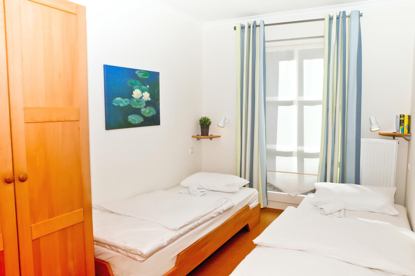 mit zwei Einzelbetten von je 0,90 m Breite eingerichtet. Die Anlage verfügt über elektr. Rolläden.