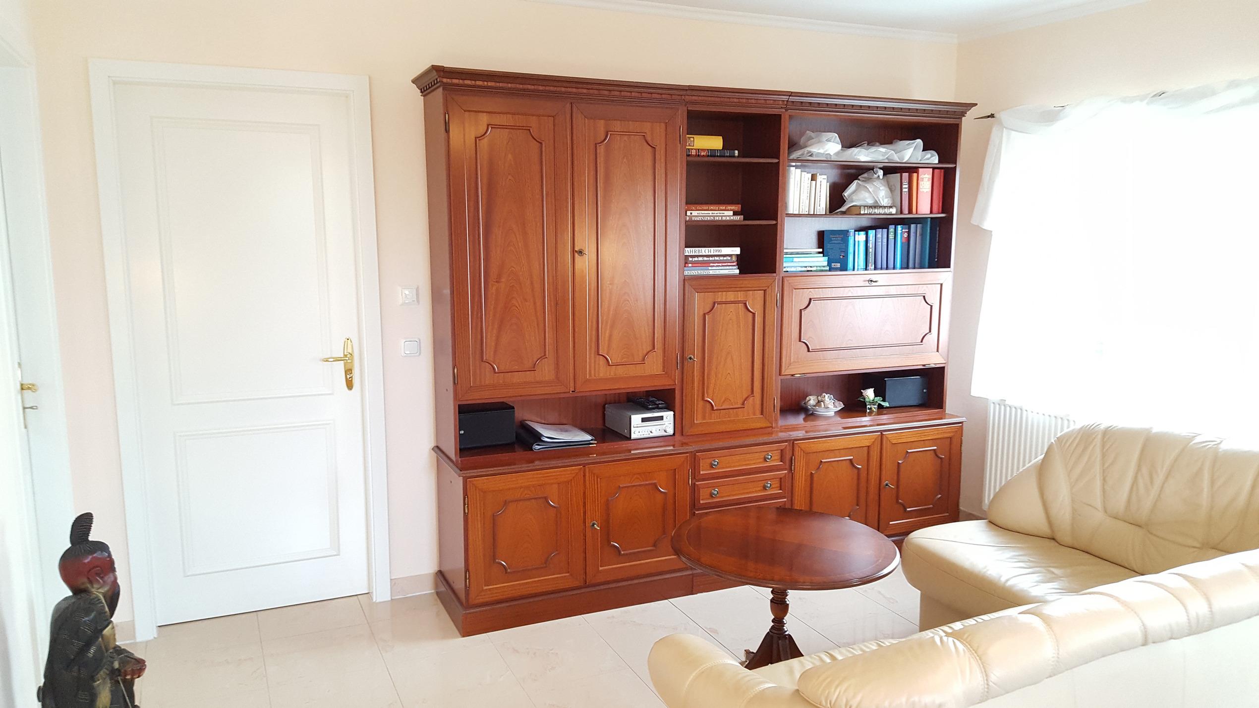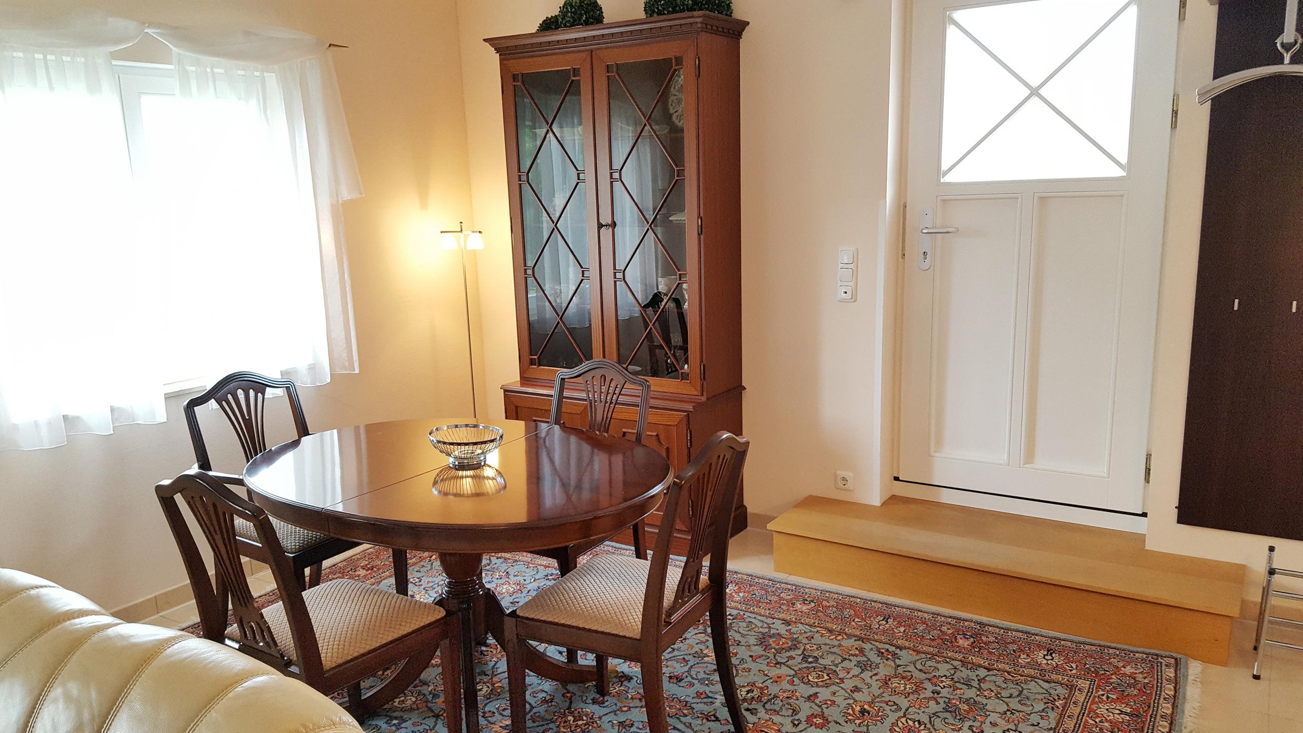 Wohnzimmer mit Stilmöbeln, Kabel-TV, DVD-Player sowie Essbereich.