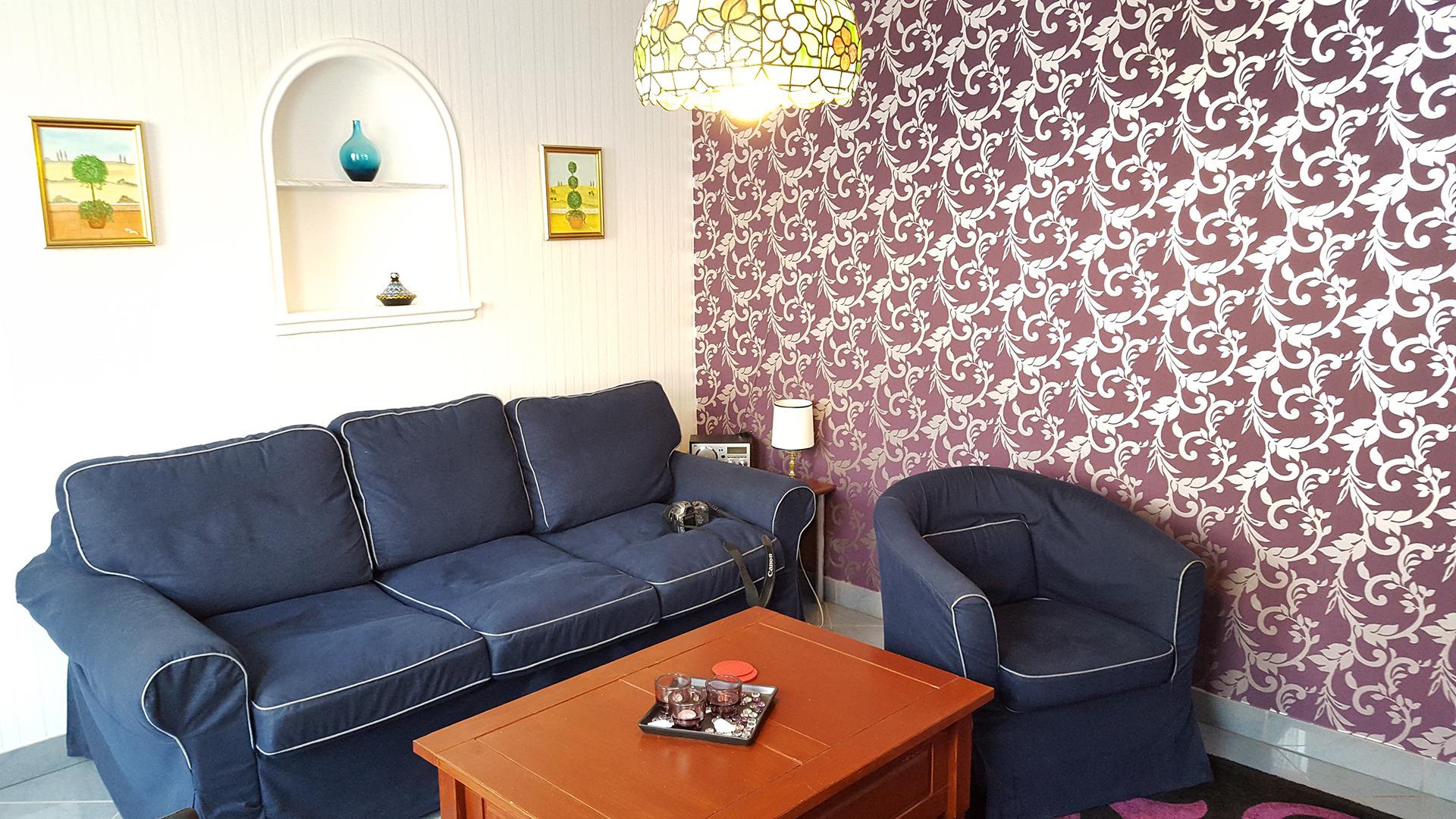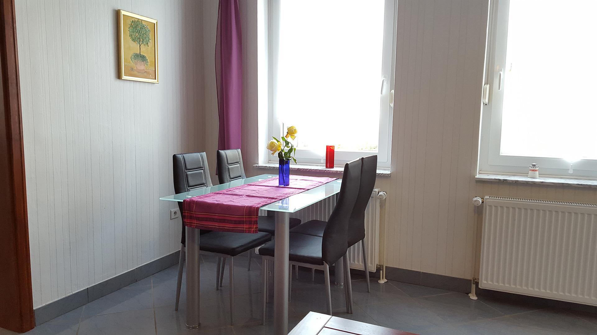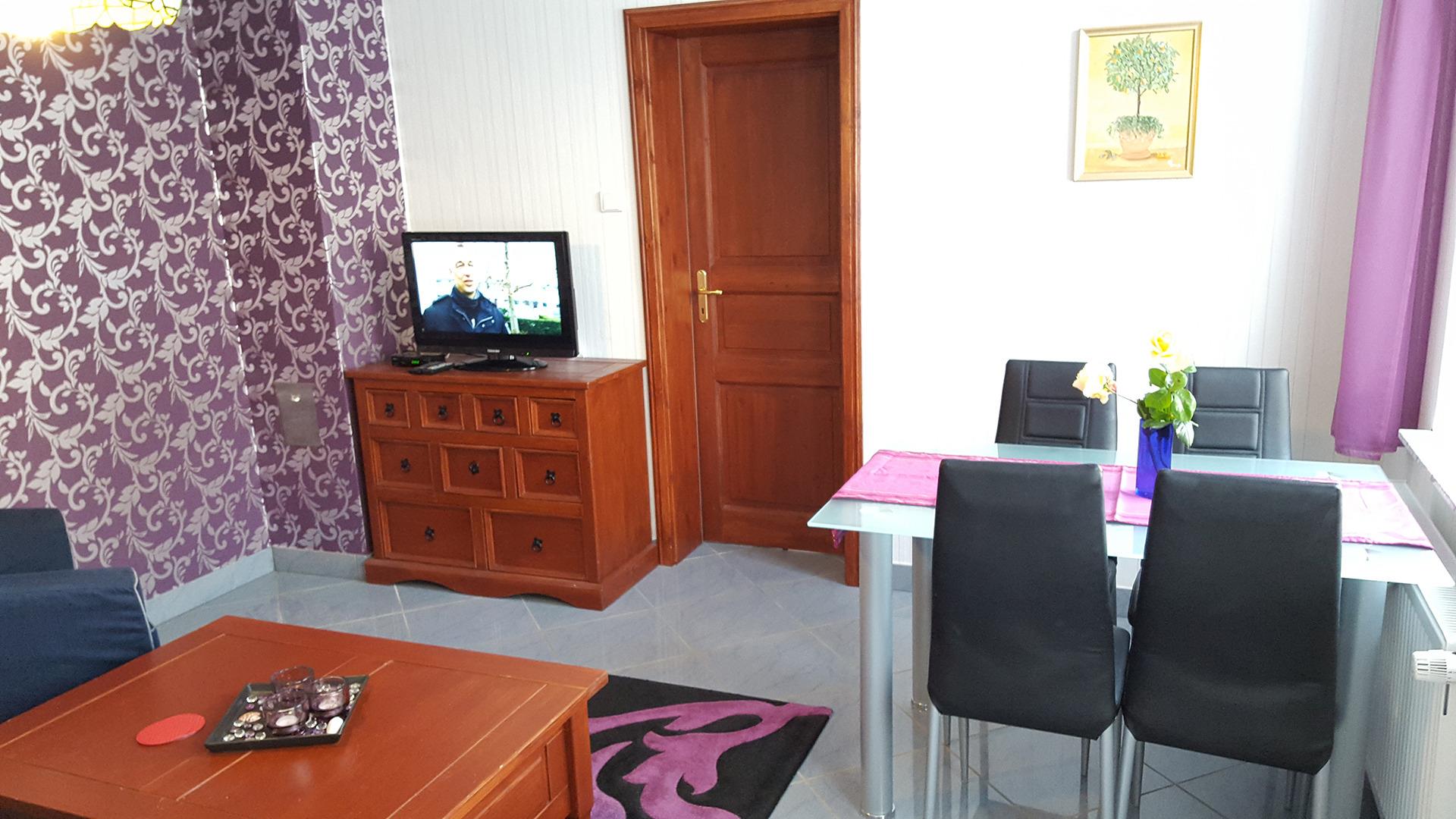 Das Wohnzimmer ist mit einer gemütlichen Couch sowie einem Sessel ausgestattet und verfügt über einen Flachbildfernseher. Im Wohnzimmer befindet sich ebenfalls der Essplatz.