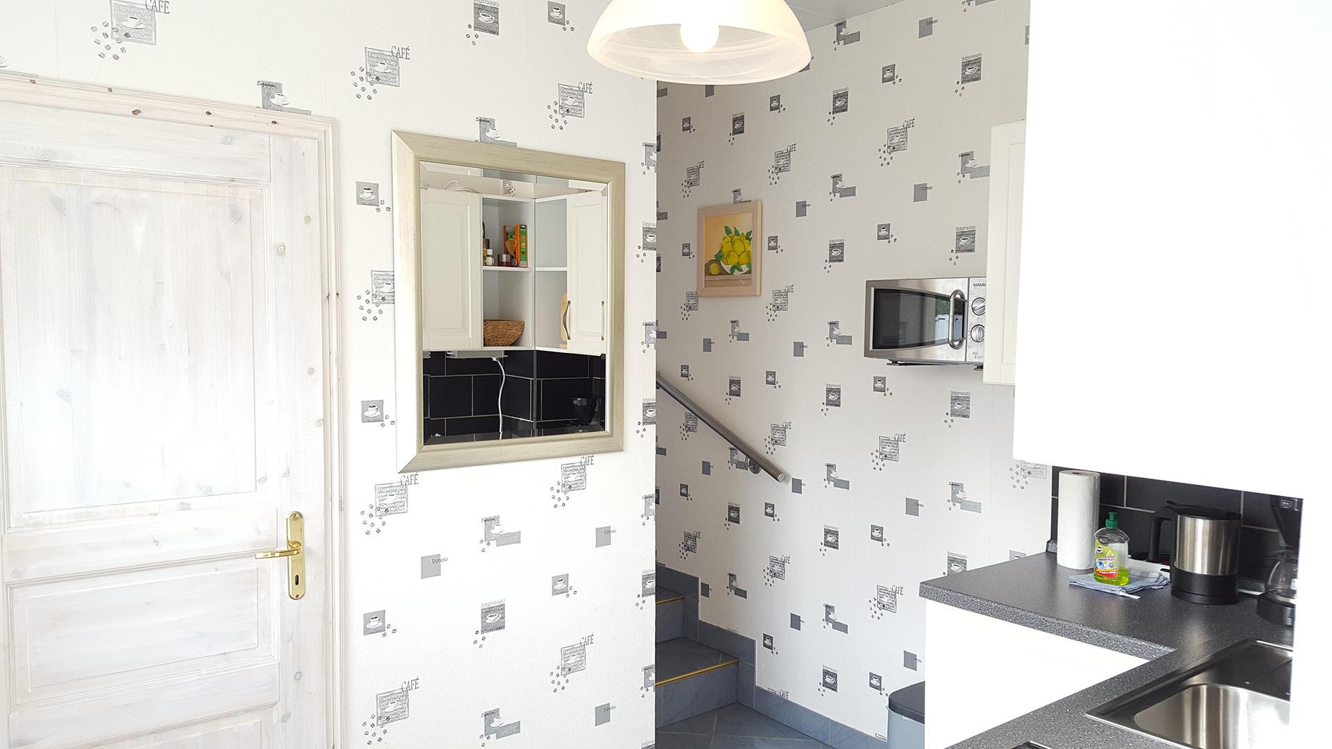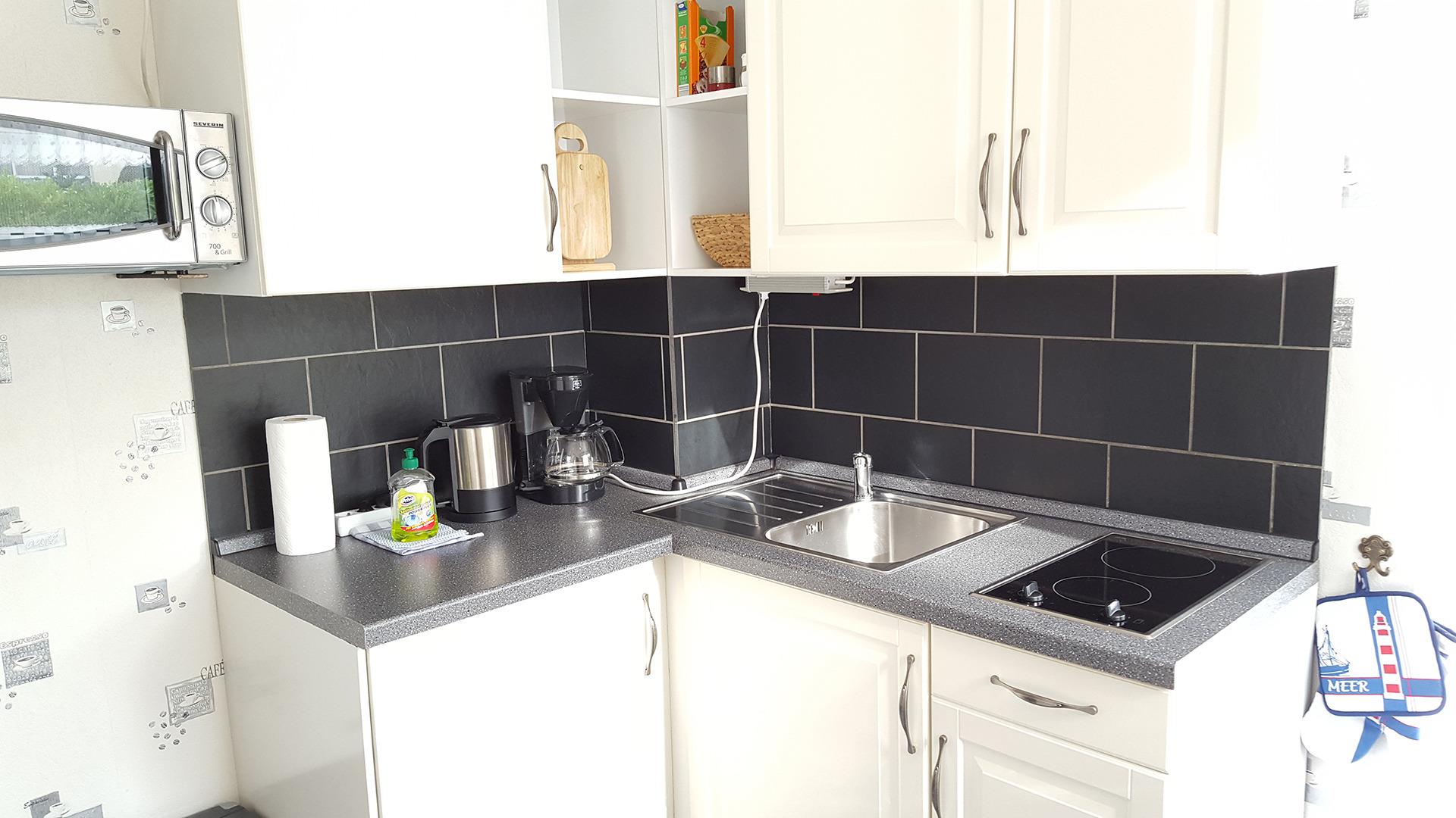 Zur Küche gehören ein 2- Plattenherd, Mikrowelle, Kühlschrank sowie Toaster, Wasserkocher und Kaffeemaschine.