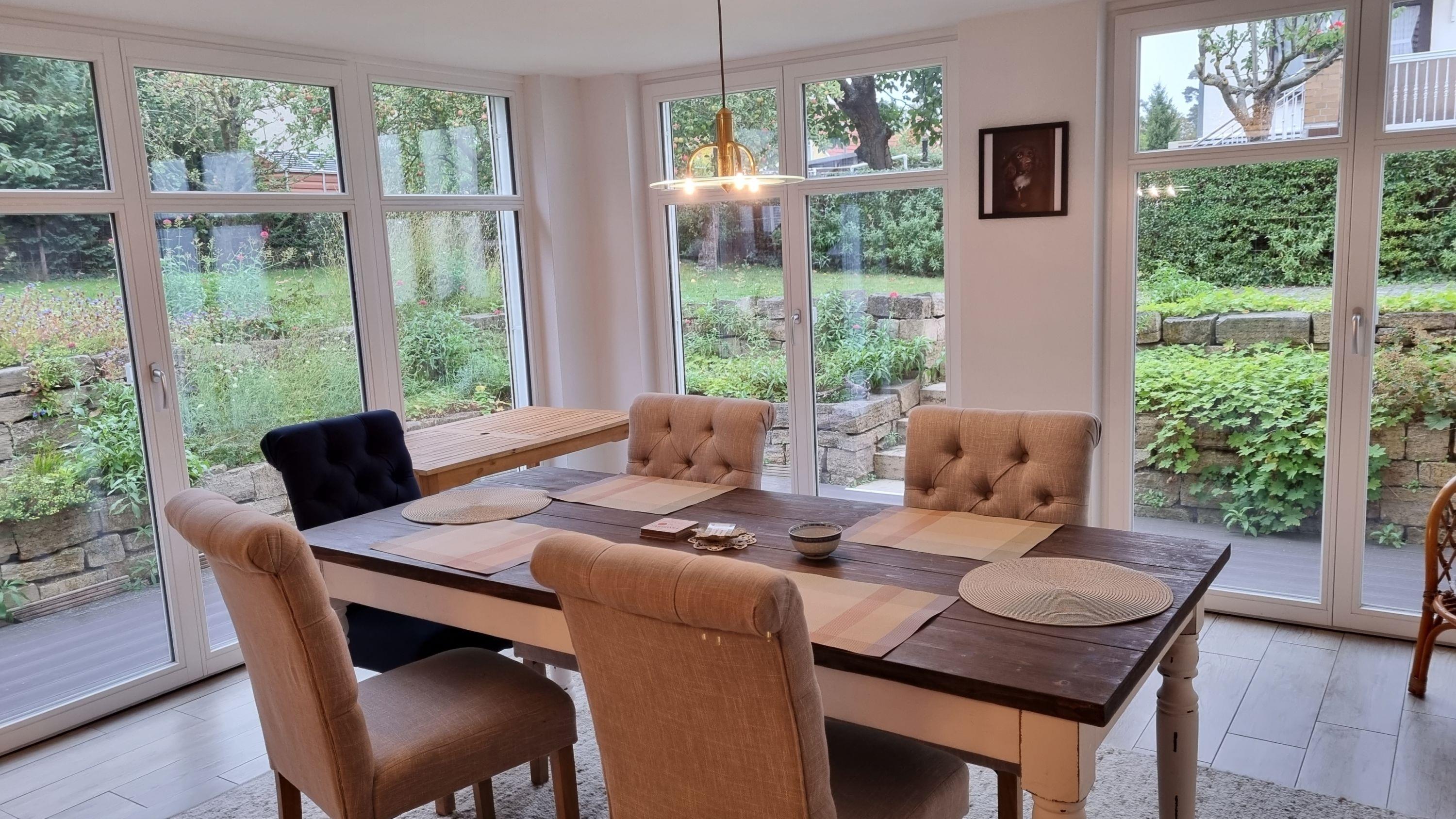 Durch die großen Glasfronten im Essbereich, blicken Sie auf Ihre Terrassen, sowie den Garten, den Sie gern nutzen dürfen.
