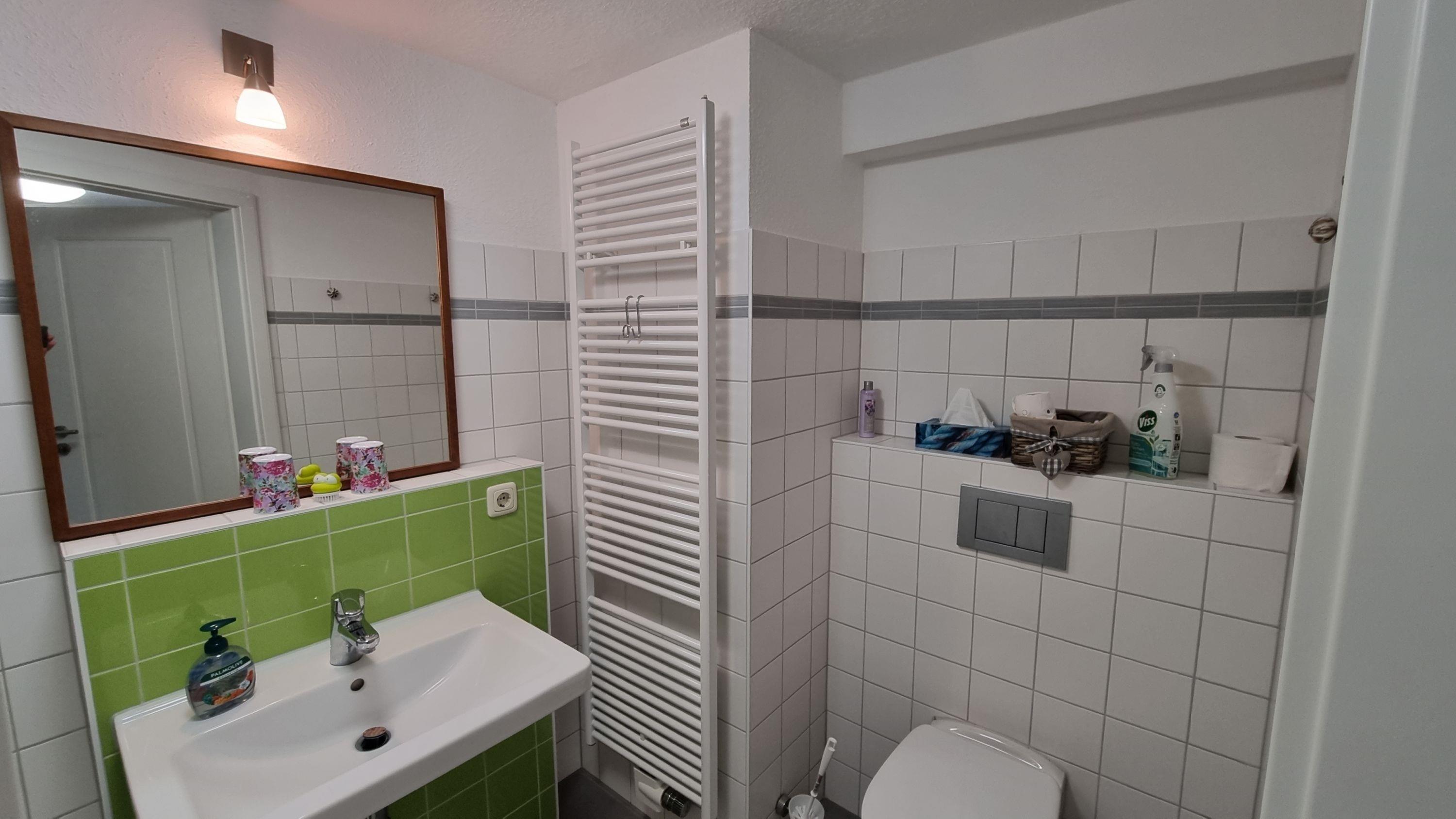 Das Badezimmer verfügt neben Waschtisch und WC, über eine Dusche mit normalem Einstieg.