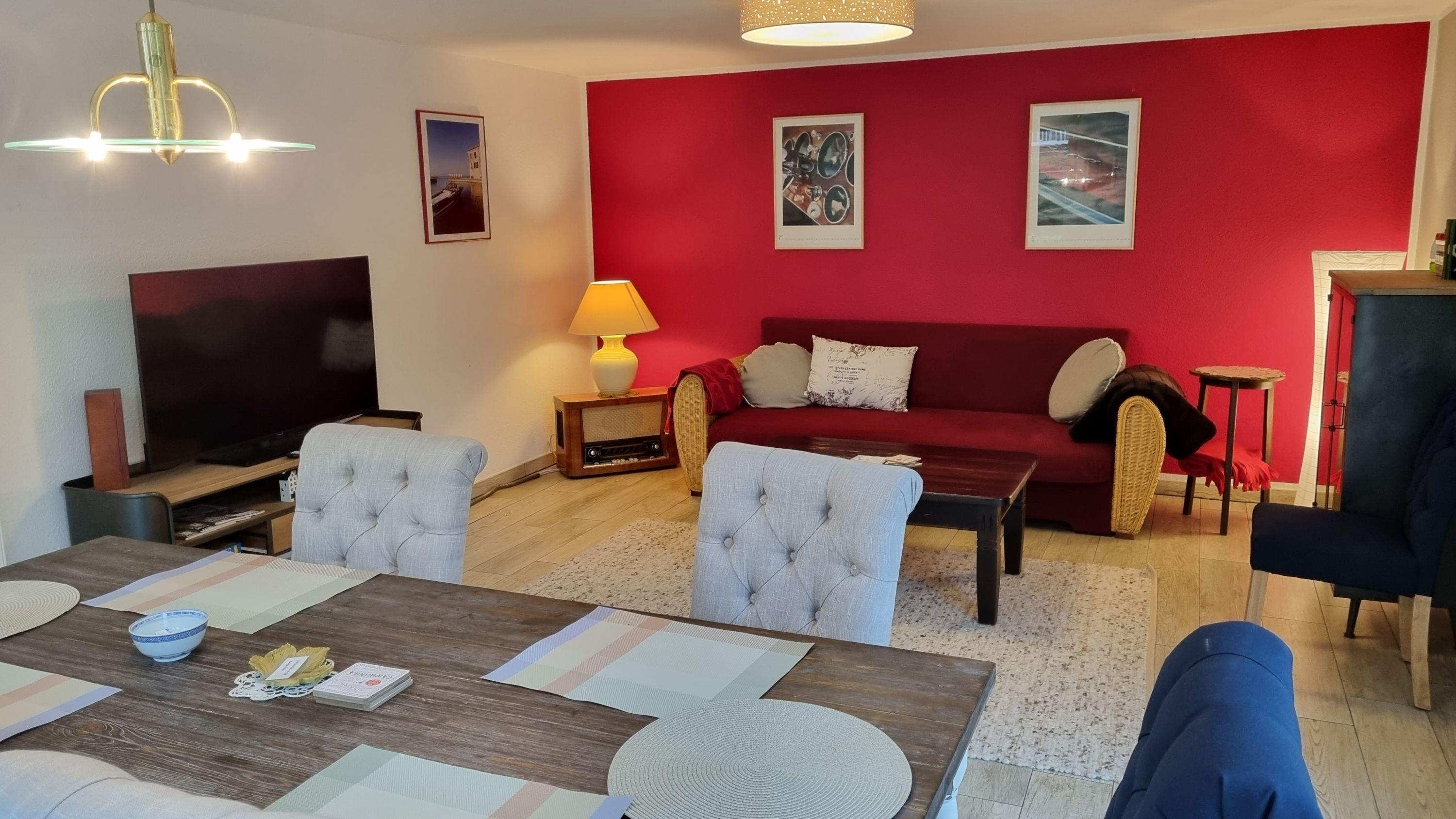 Im offenen Wohnzimmer mit einer Schlafcouch und einem großen Flachbildfernseher, integriert sich der großzügige lichtdurchflutete Essbereich.