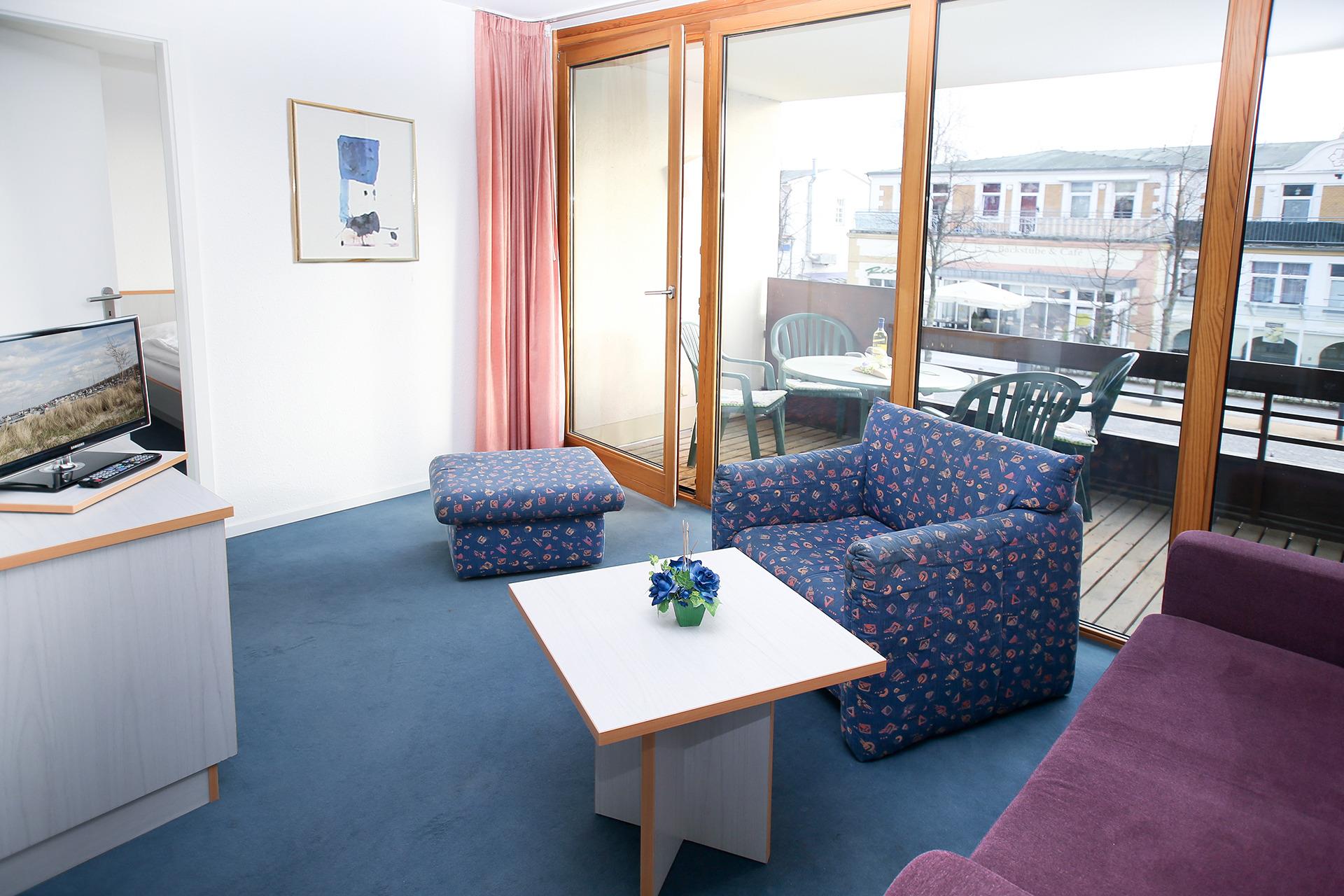 Die gemütliche 2-Zimmer-Fewo liegt im 1. OG und ist ca. 50 m² groß. Vom Balkon können Sie das rege Treiben in der Strandstrasse beobachten.