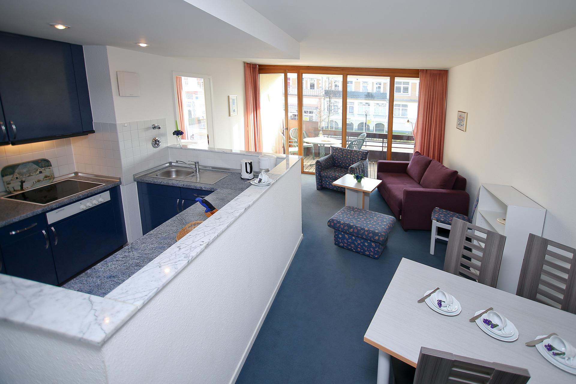 Für 2-4 Personen bietet die Wohnung ein Schlafzimmer mit Doppelbett und einen großen Wohnbereich mit Doppelschlafcouch, Esstisch sowie eine Pantryküche mit Geschirrspüler.