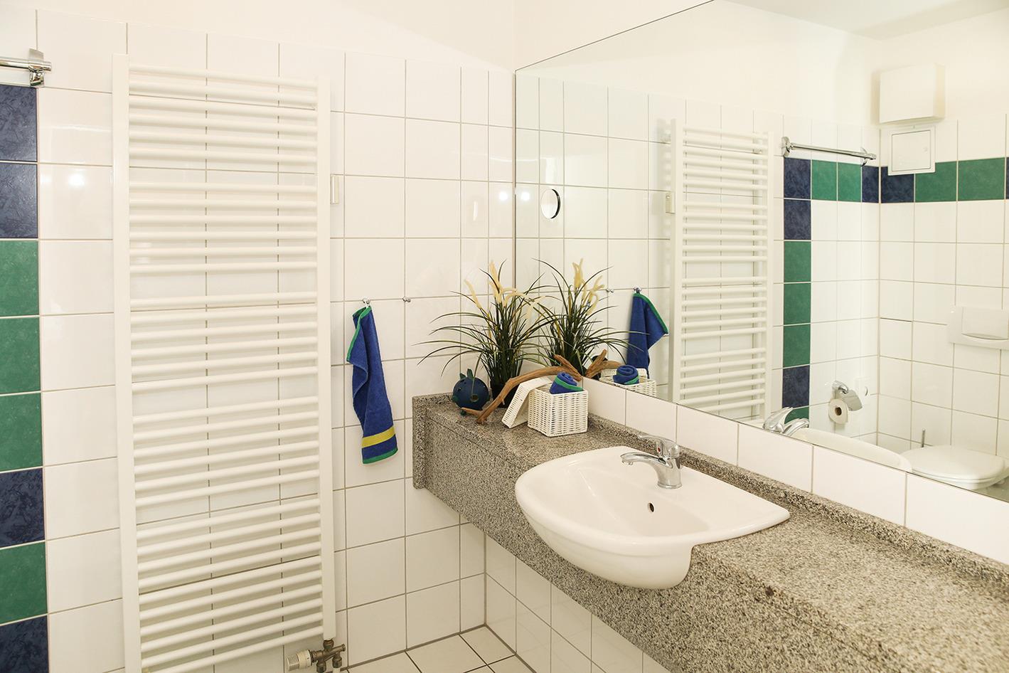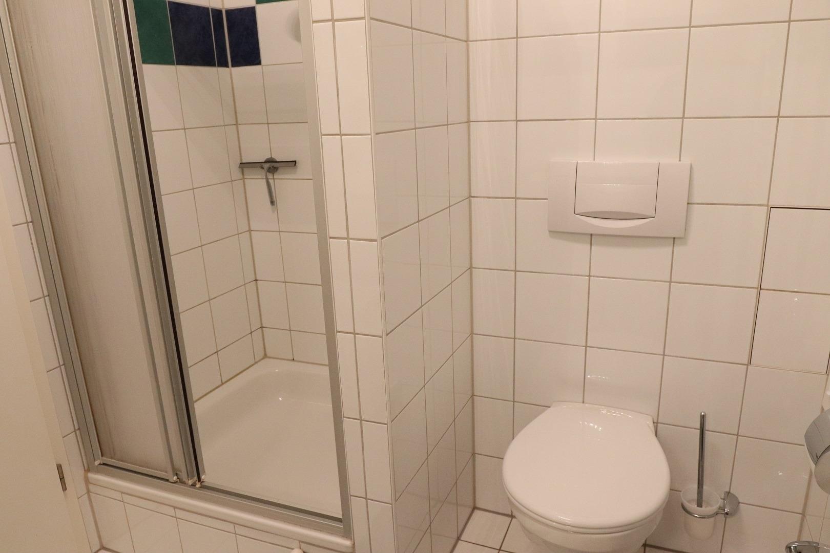 Das Duschbad/WC ist geräumig und hat sowohl einen großen Wand- als auch einen Kosmetikspiegel.