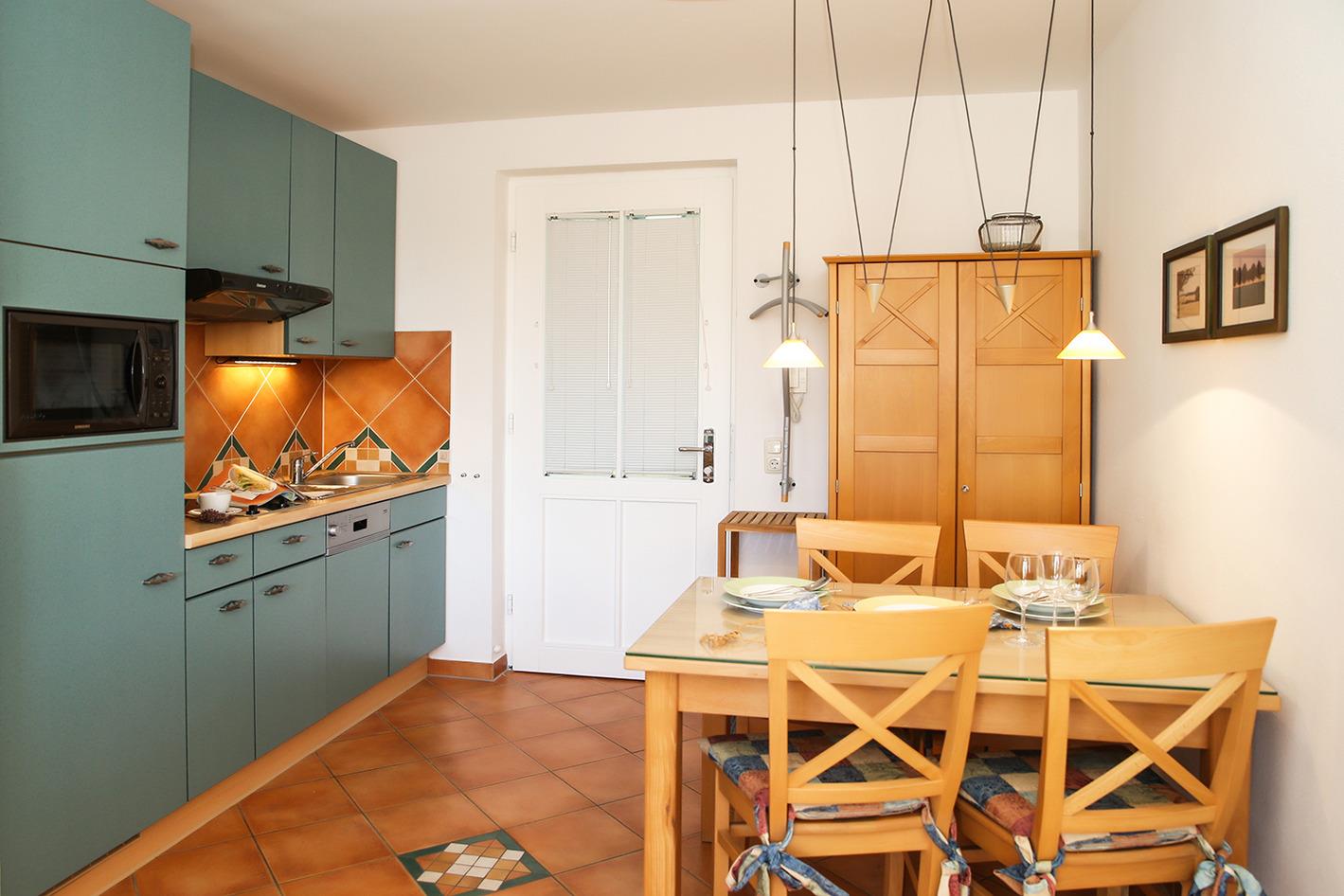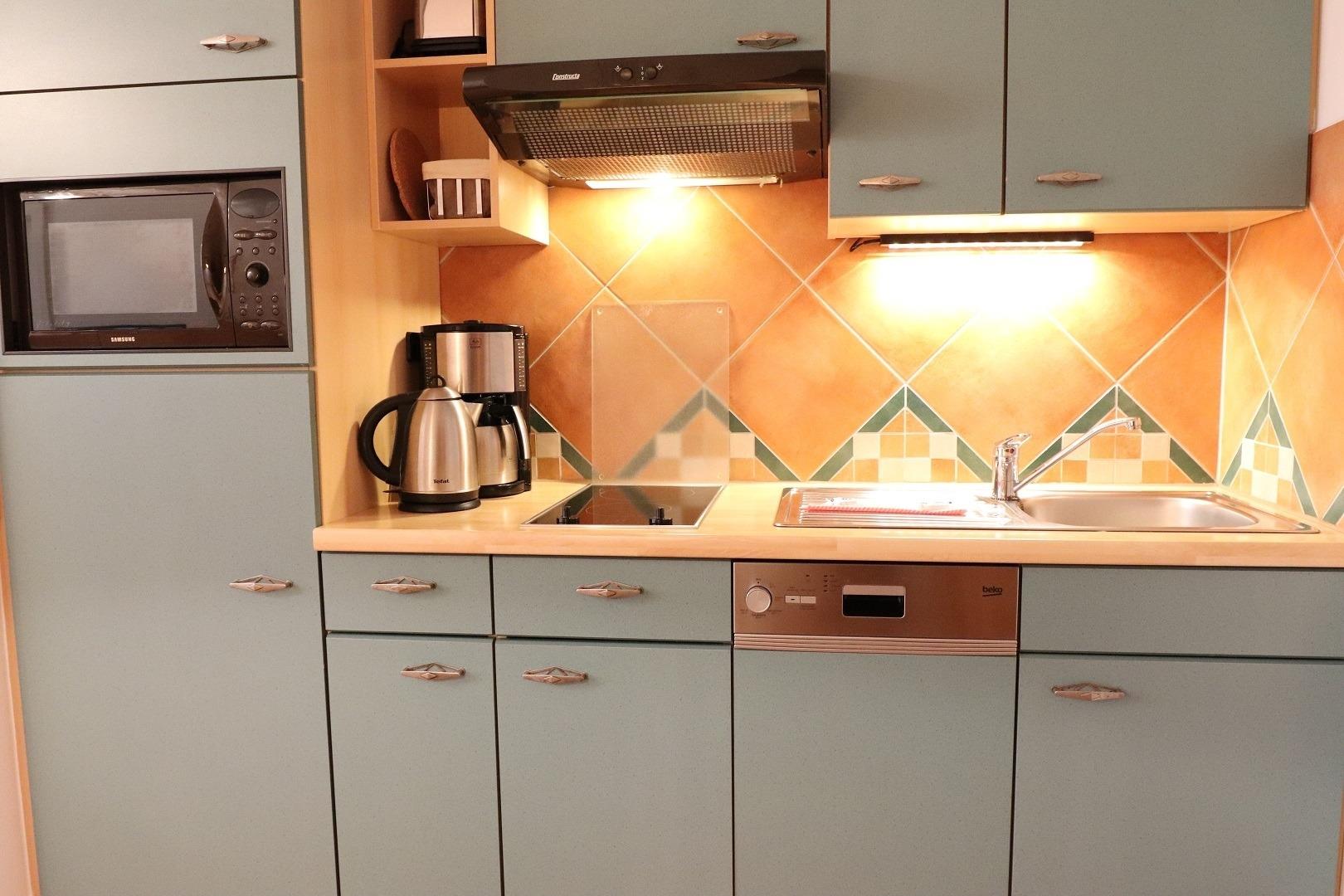 Die in den Wohnbereich integrierte offene Einbauküche verfügt über einen Essplatz für vier Personen und ist mit einem 2-Platten-Ceranfeld, Geschirrspüler, Mikrowelle etc. ausgestattet.