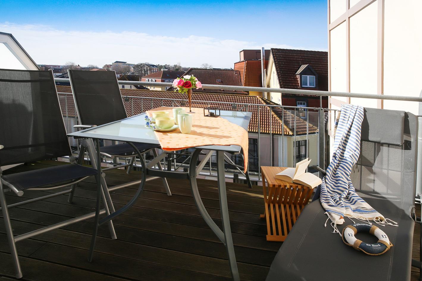 Auf dem Balkon finden Sie einen Sitzplatz für vier Personen, Sonnenliege, Wäscheständer und Sonnenschirm vor. Er liegt geschützt auf der Westseite und ermöglicht einen eingeschränkten Ausblick aufs Meer.