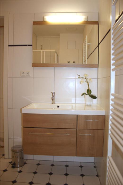 Das weiße Bad mit Dusche und großem Waschtisch macht die Wohnung komplett.