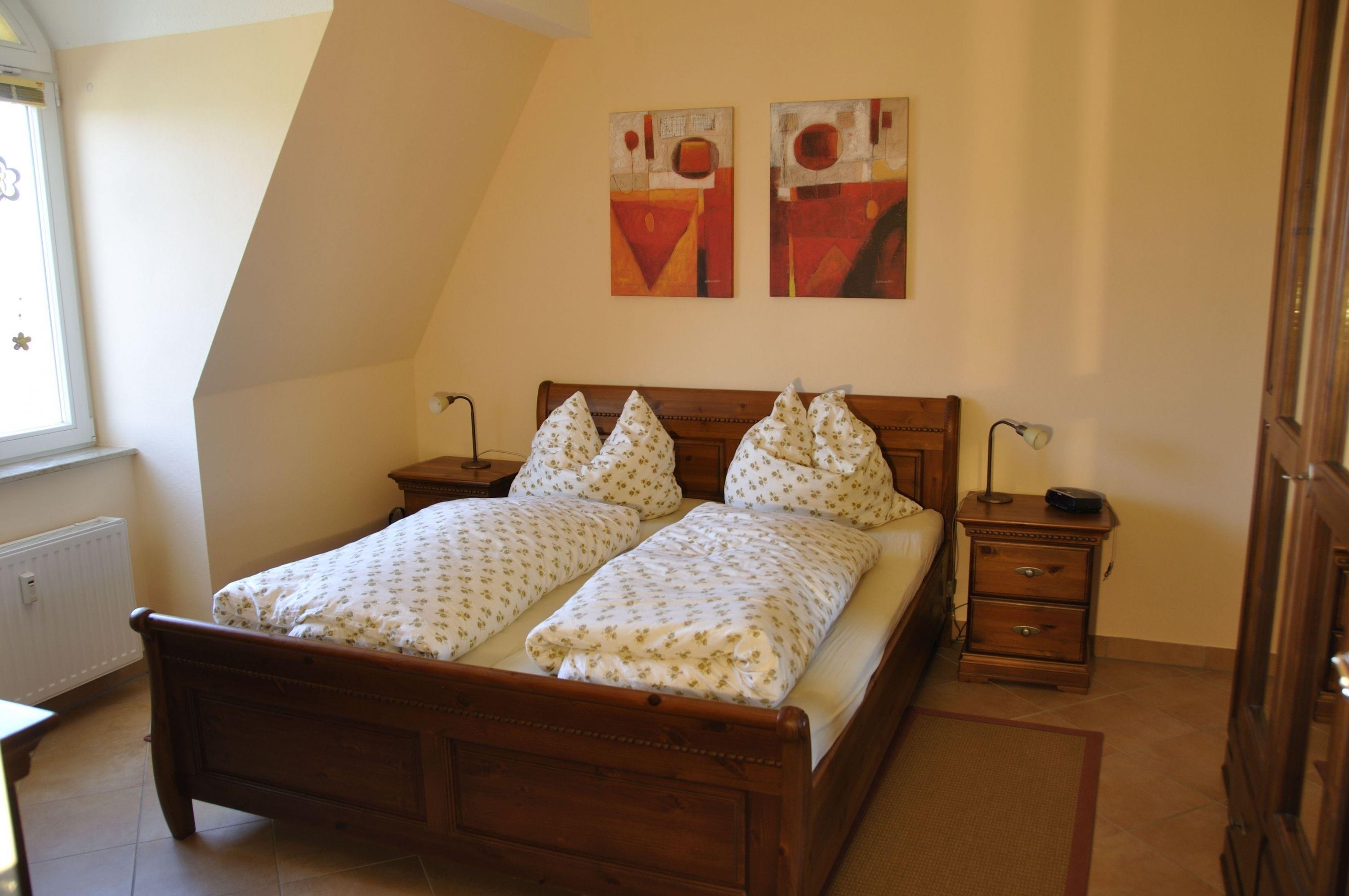 Im Schlafzimmer befindet sich ein Doppelbett. Das Duschbad/WC mit Fußbodenheizung ergänzt die Ferienwohnung.