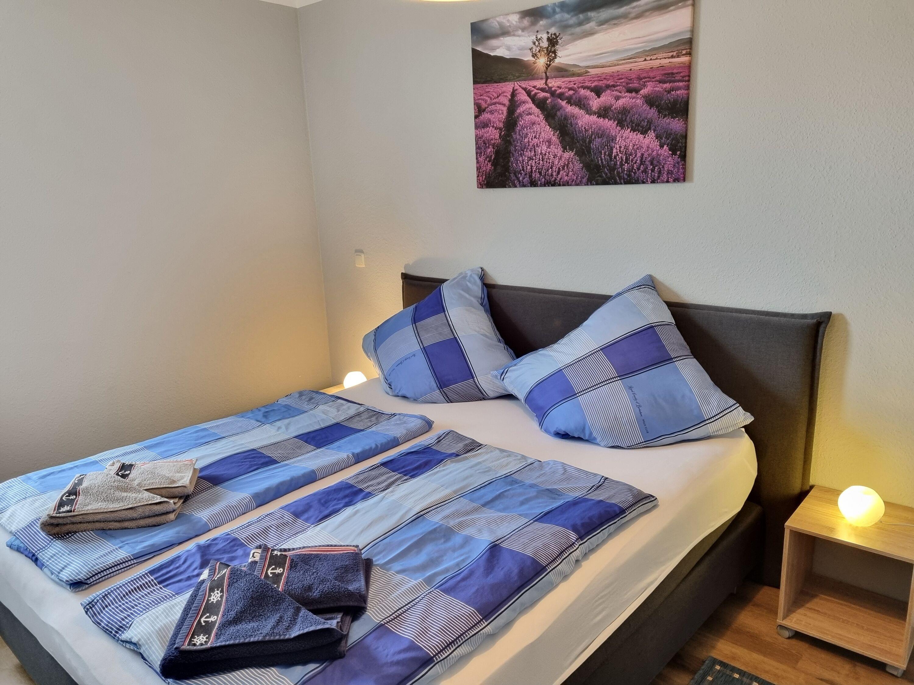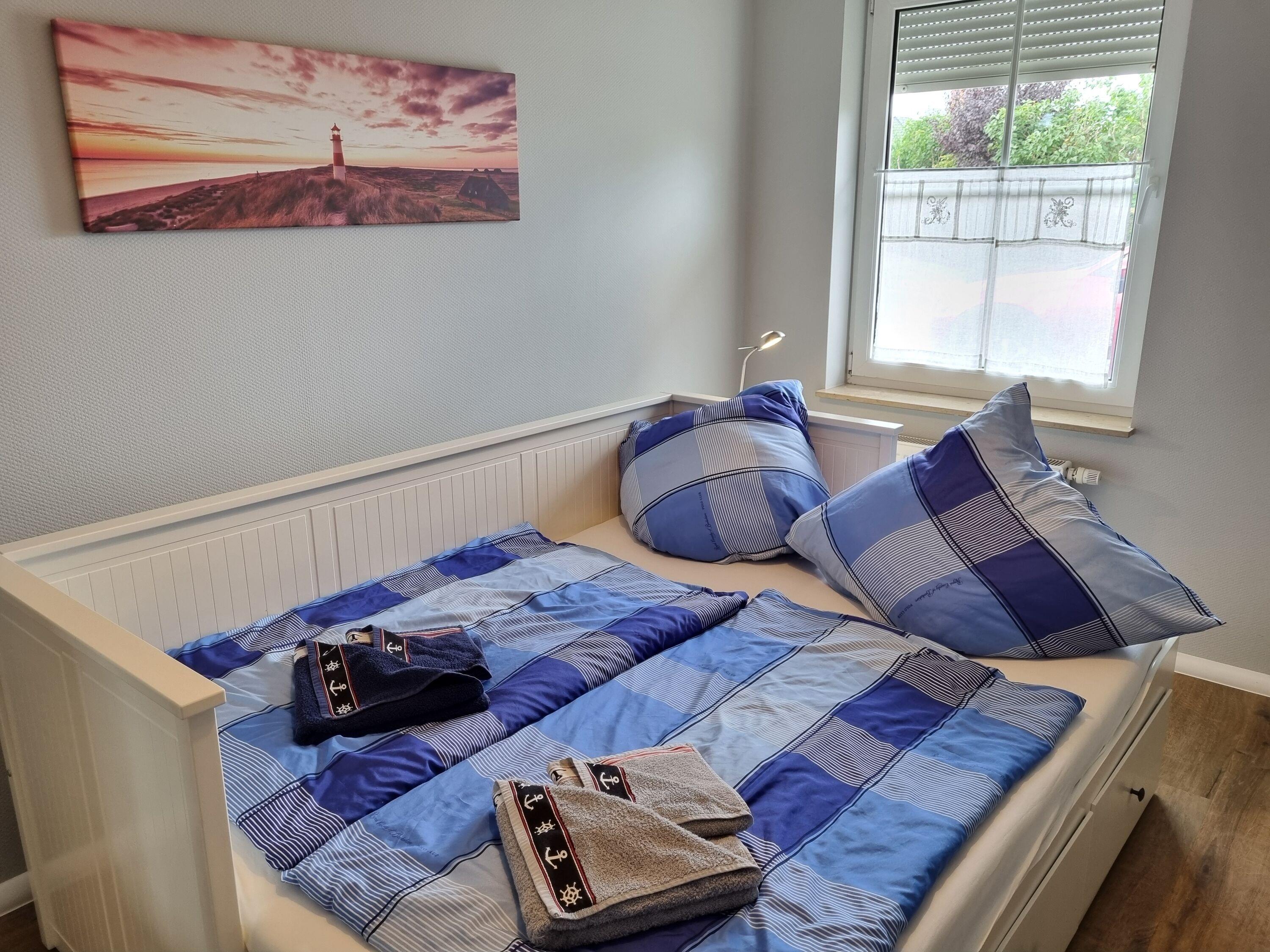Die Wohnung ist großzügig geschnitten und verfügt über 3 Zimmer auf insgesamt 60m² im Erdgeschoss. Sie bietet Platz für 4 Personen und verfügt über zwei Schlafzimmer, eines mit einem Doppelbett und eines mit einem ausziehbaren Einzelbett für jeweils bis zu 2 Personen.
