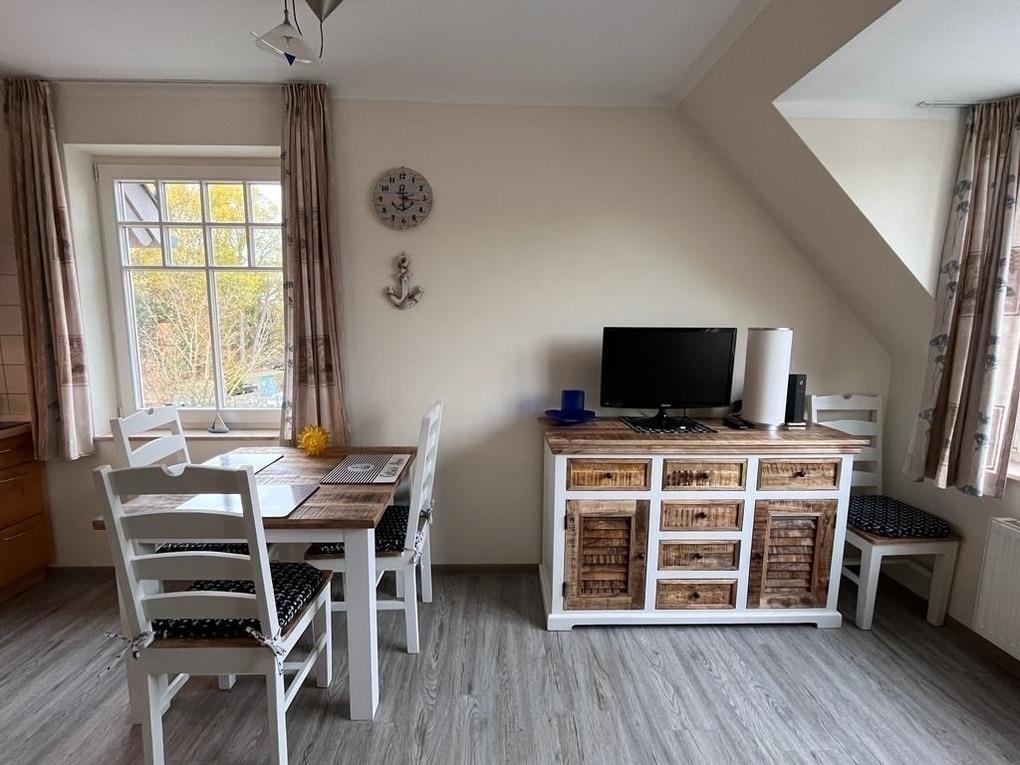 Die Küchenzeile ist voll ausgestattet mit Mikrowelle, Kaffeemaschine, Toaster, Wasserkocher, Geschirrspüler, Kühlschrank mit Gefrierfach, E-Herd mit Cerankochfeld und Dunstabzugshaube, diversen Töpfen und Pfannen. Ein kompletter 6-teiliger Geschirrsatz, bestehend aus Tellern, Besteck Bier-, Sekt-, Likör- und Saft-Gläsern ist vorhanden.