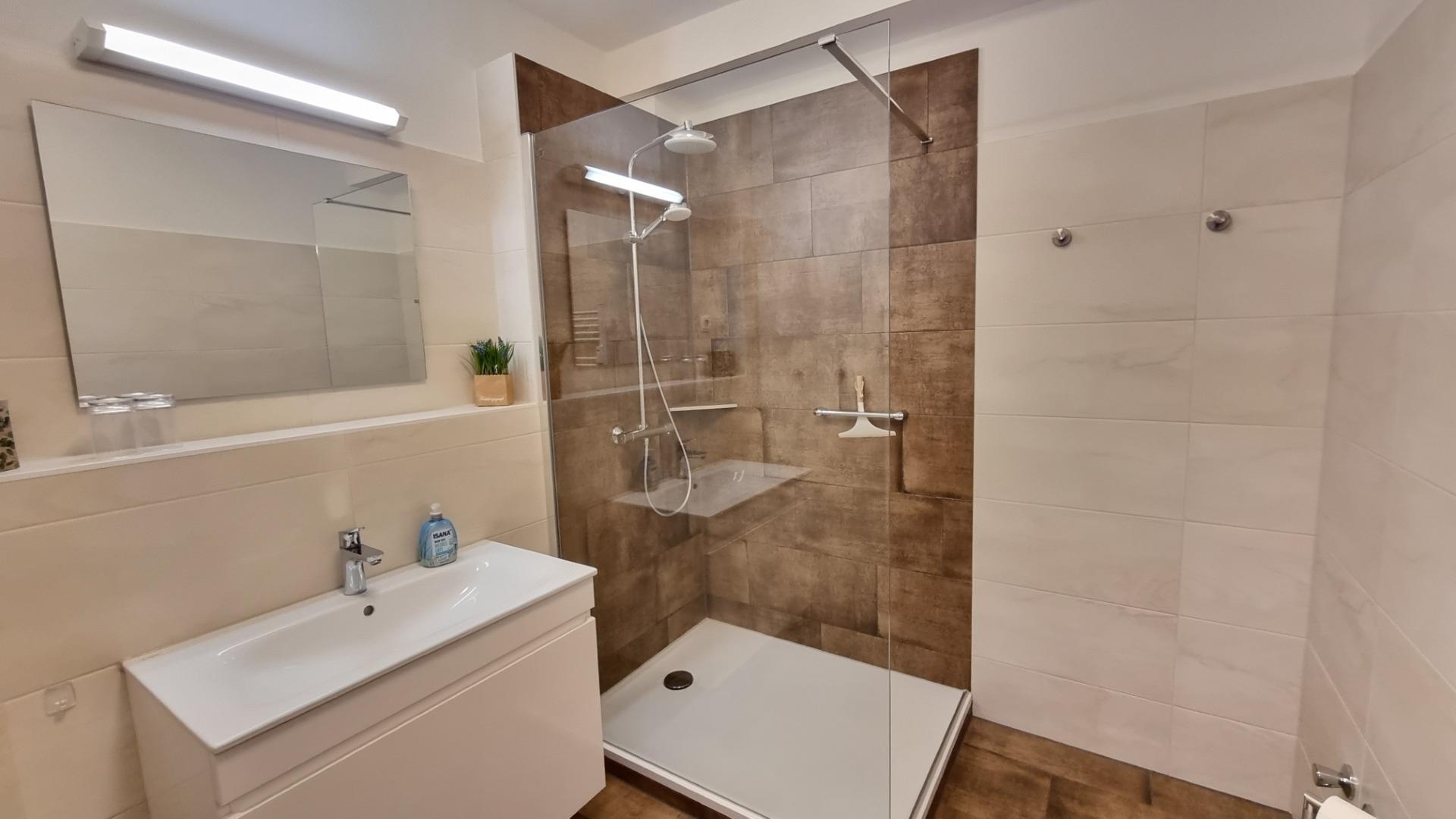 Im komplett neu sanierten und geräumigen Bad befindet sich eine Dusche mit flachem Einstieg.