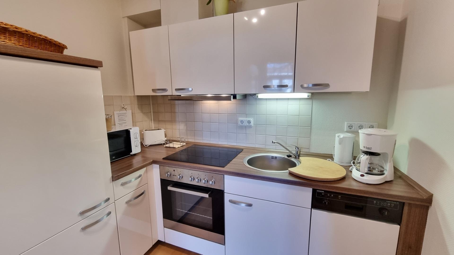 Die Pantryküche verfügt über ein Cerankochfeld, einen Backofen, einer Mikrowelle, einem Geschirrspüler sowie einem Kühlschrank inklusive Gefrierfach.