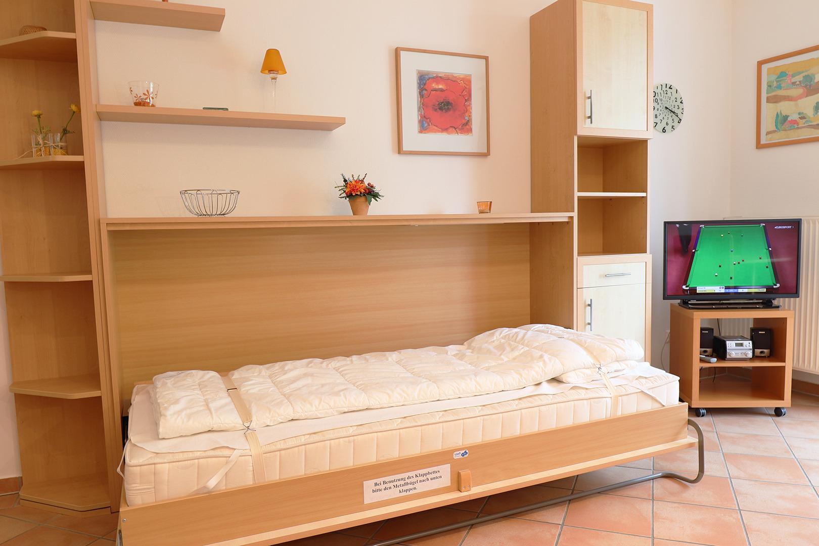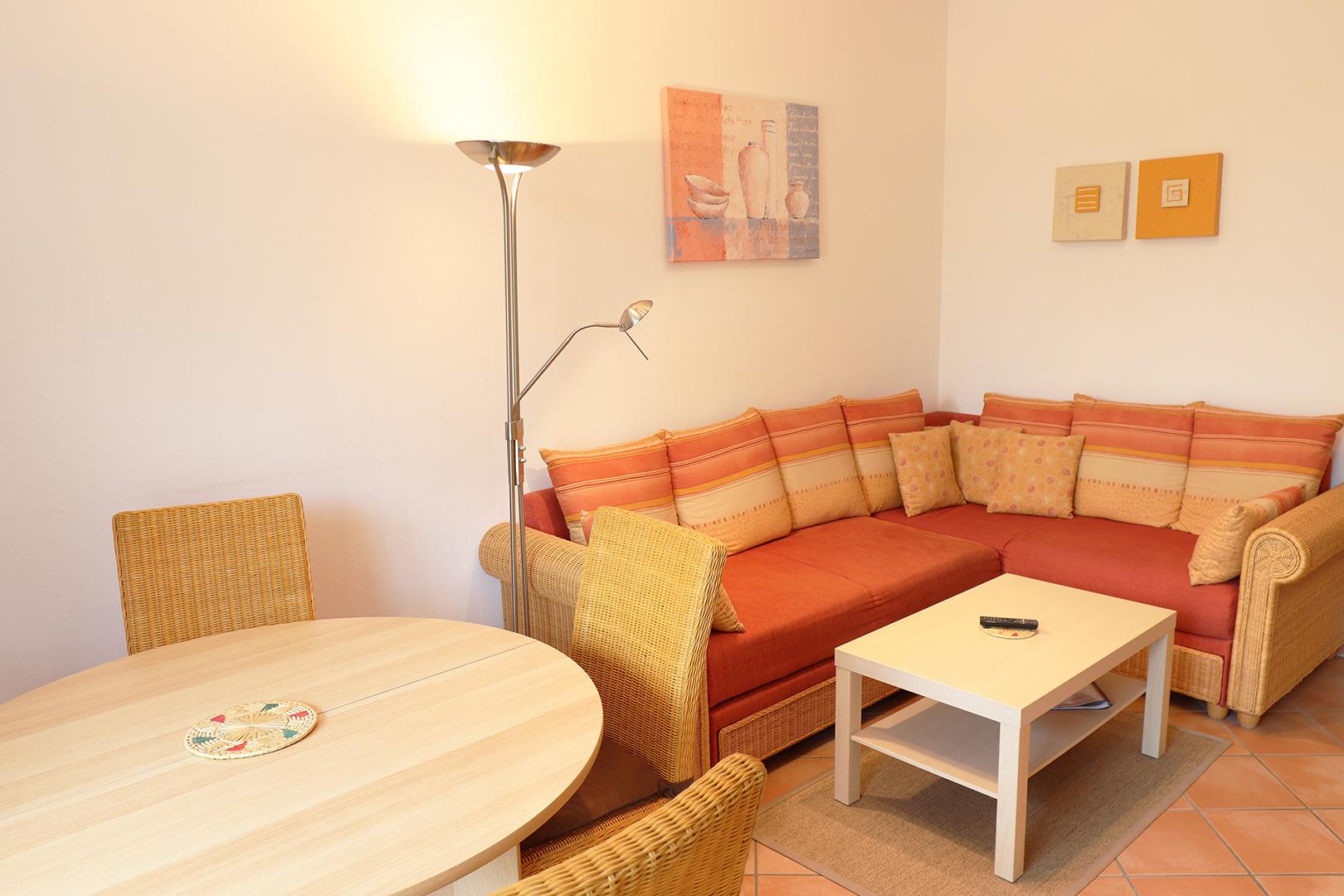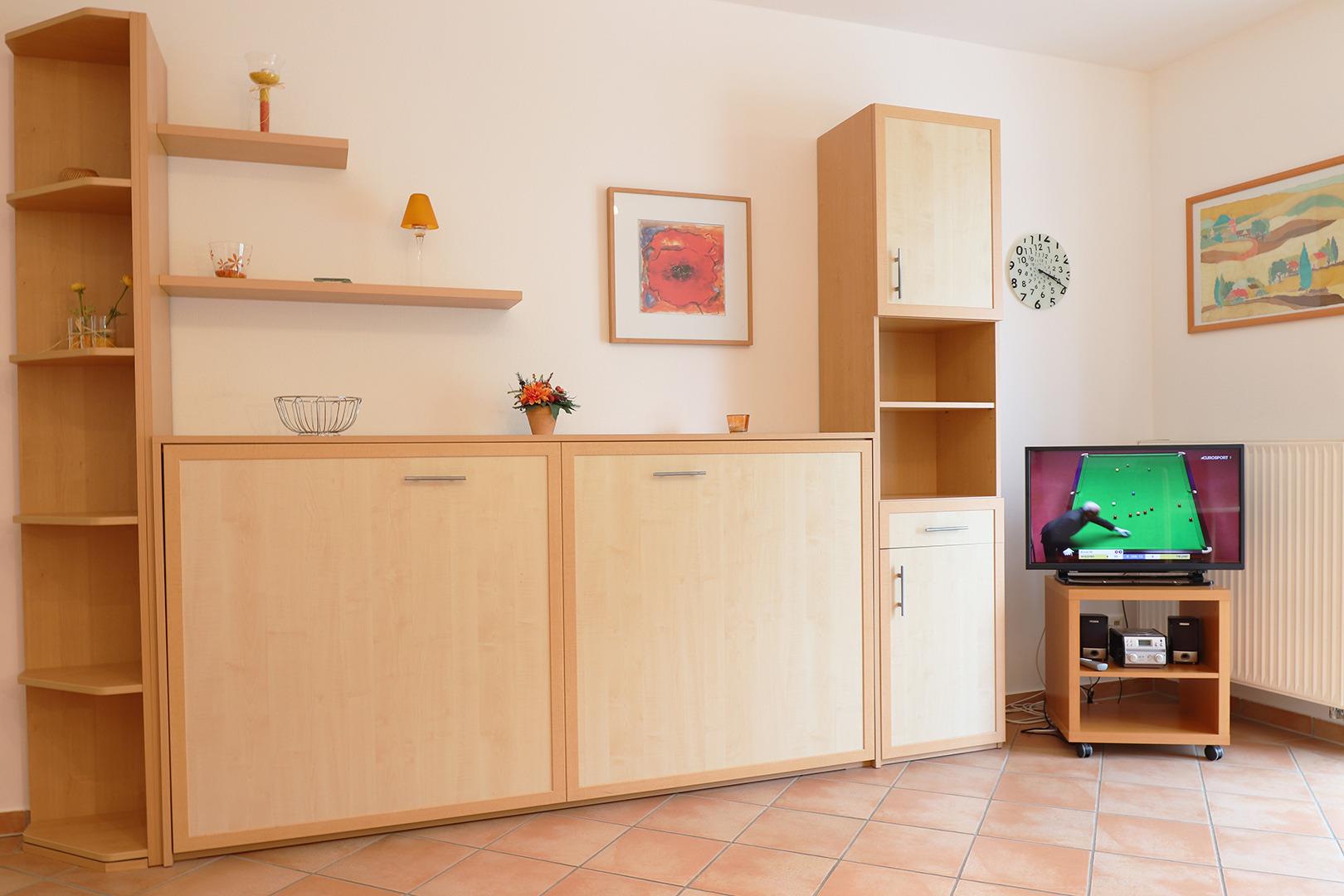 Im großen Schlafzimmer finden Sie ein Doppelbett. Hell und freundlich eingerichtet verfügt der Wohnbereich über eine Sitzgruppe und Esstisch sowie eine ausziehbare Couch und ein Schrankbett.