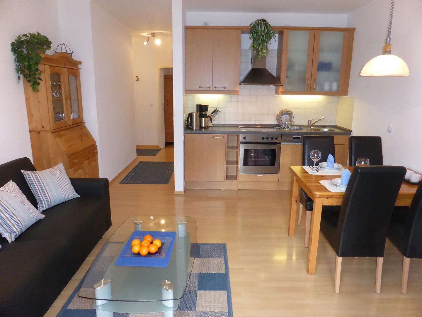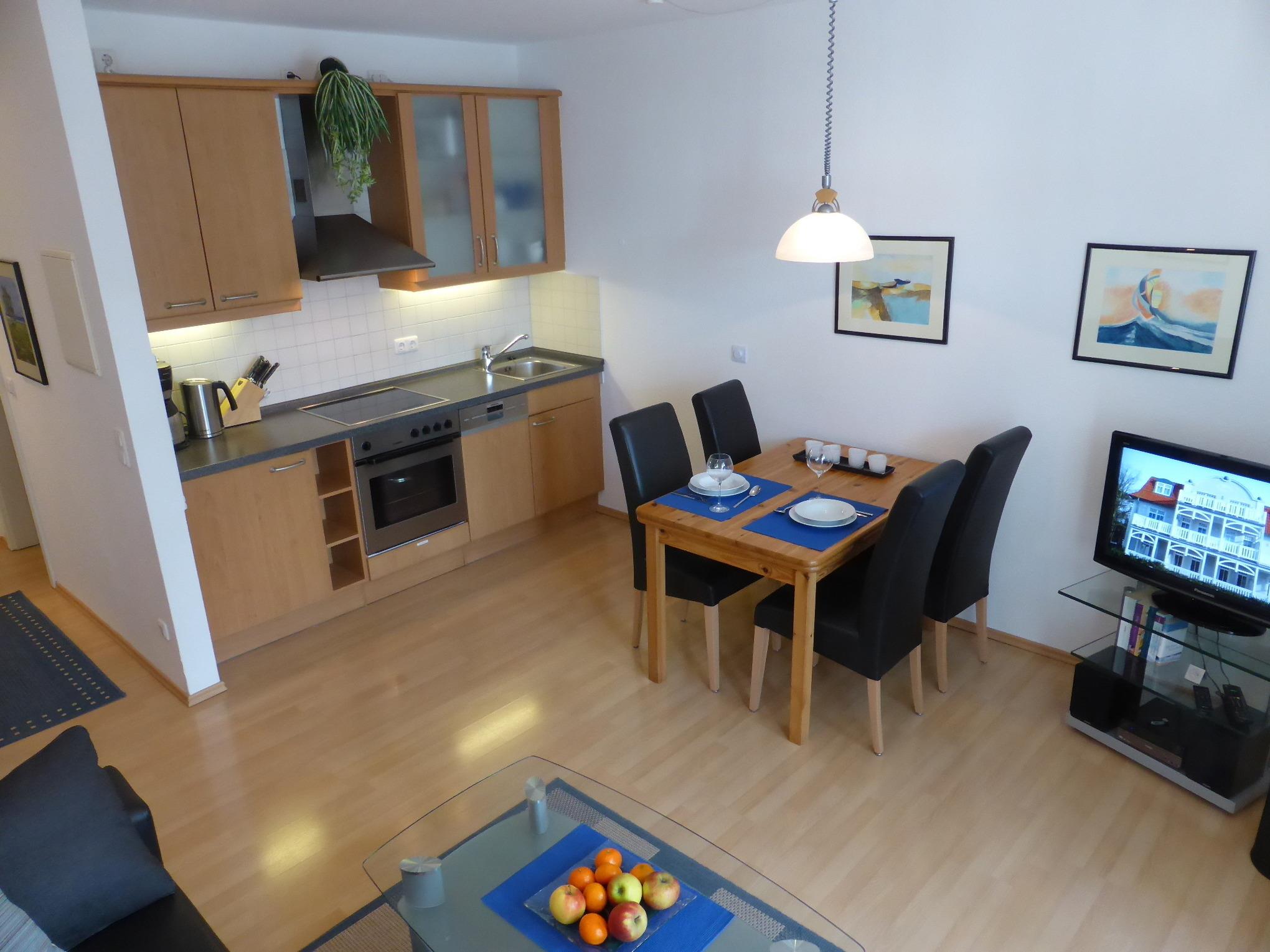 In die modern eingerichtete Küchenzeile, die in den Wohnbereich integriert ist, gehören ein Ceran-Kochfeld mit 4 Platten, ein Backofen und eine Geschirrspülmaschine. Zur Ausstattung gehören außerdem ein 40" LED-Fernseher, eine Hifi-Anlage mit Kabelanschluss, CD- und DVD-Player sowie ein USB-Anschluss für SDCards (MP3). Ein kostenloser W-LAN Anschluss steht ebenfalls zur Verfügung.