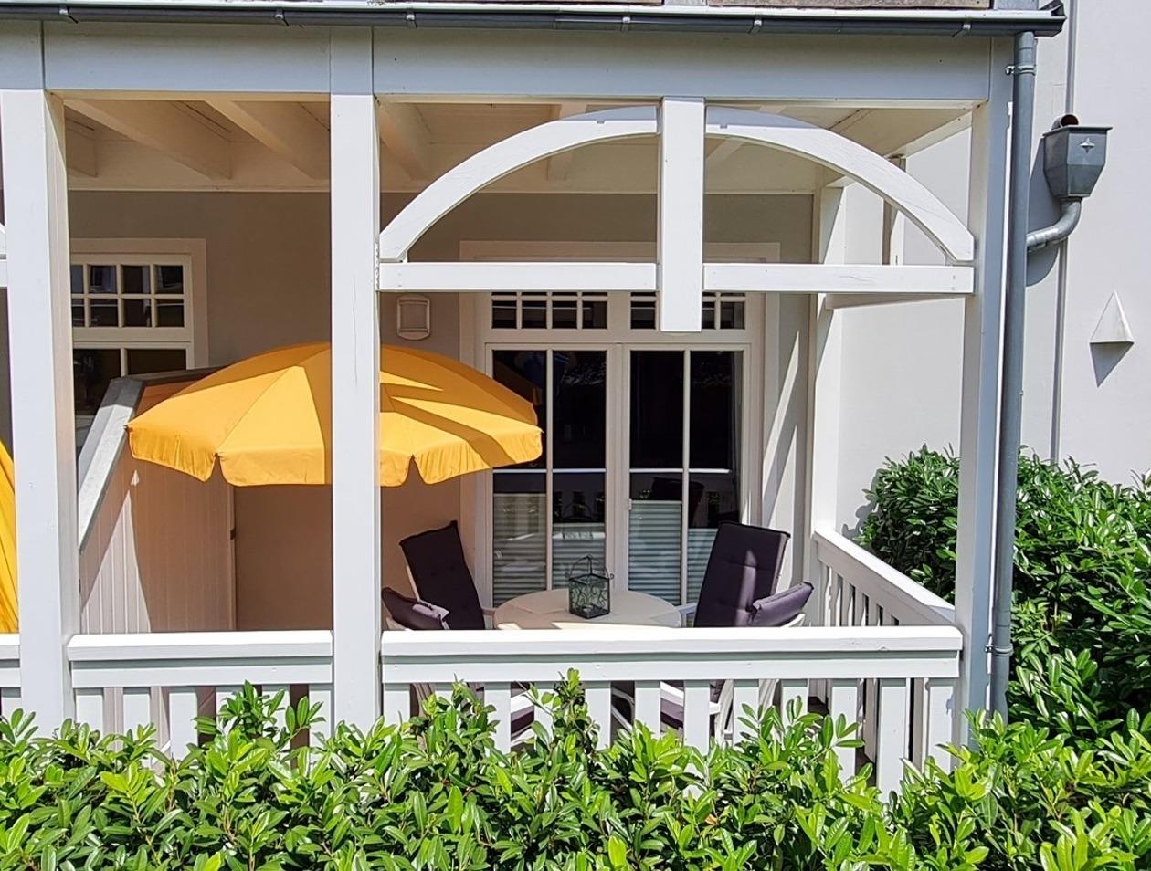 Die Ferienwohnung verfügt zudem über eine überdachte Süd-Terrasse, auf der man entspannen und die Sonne genießen kann.
