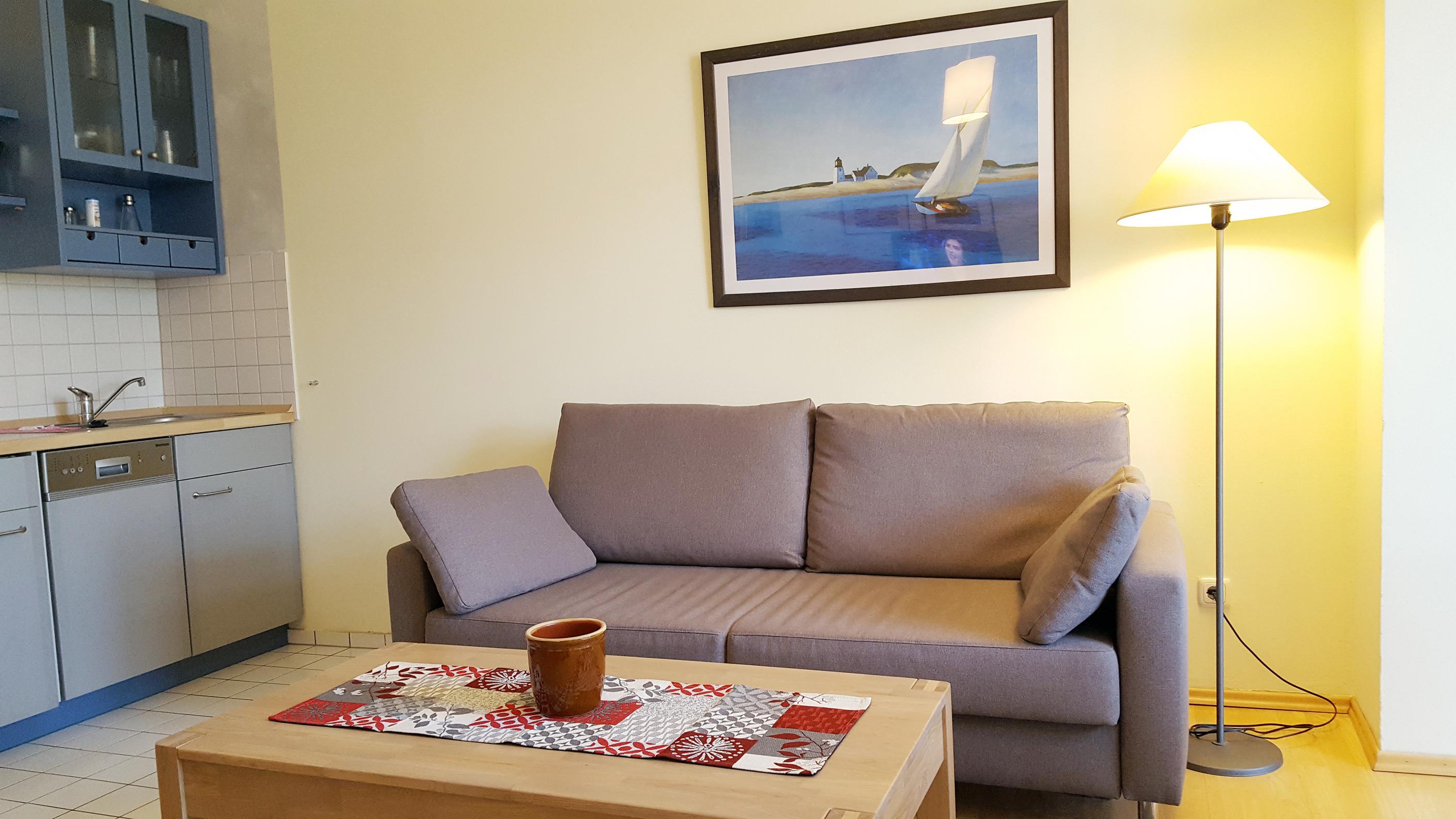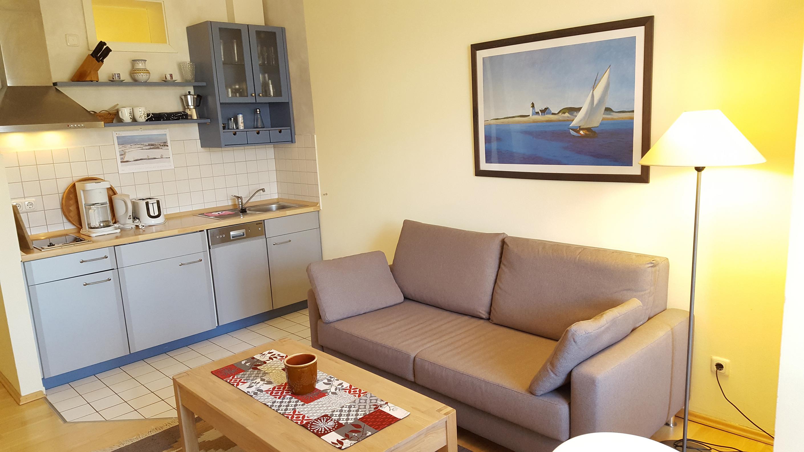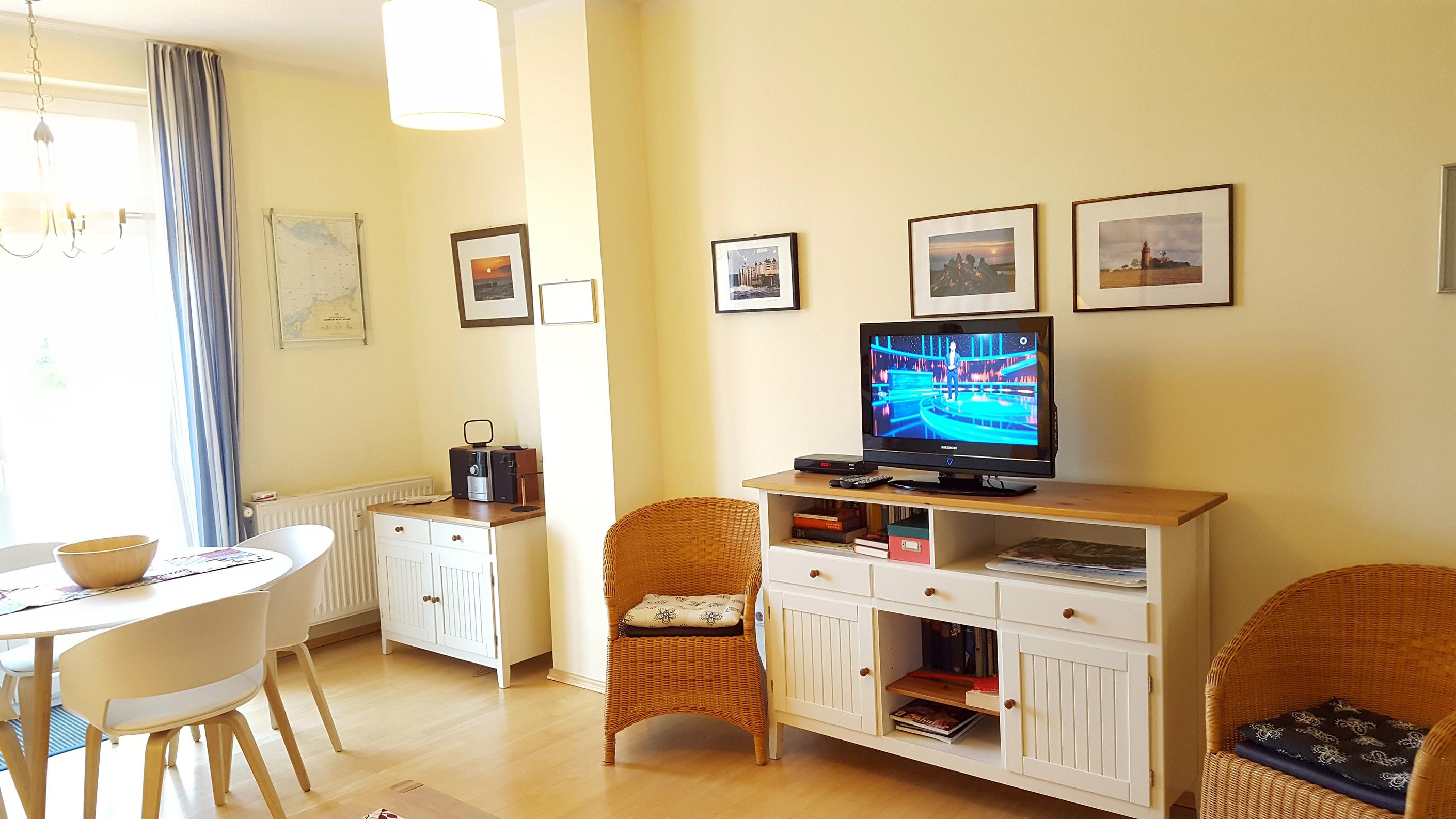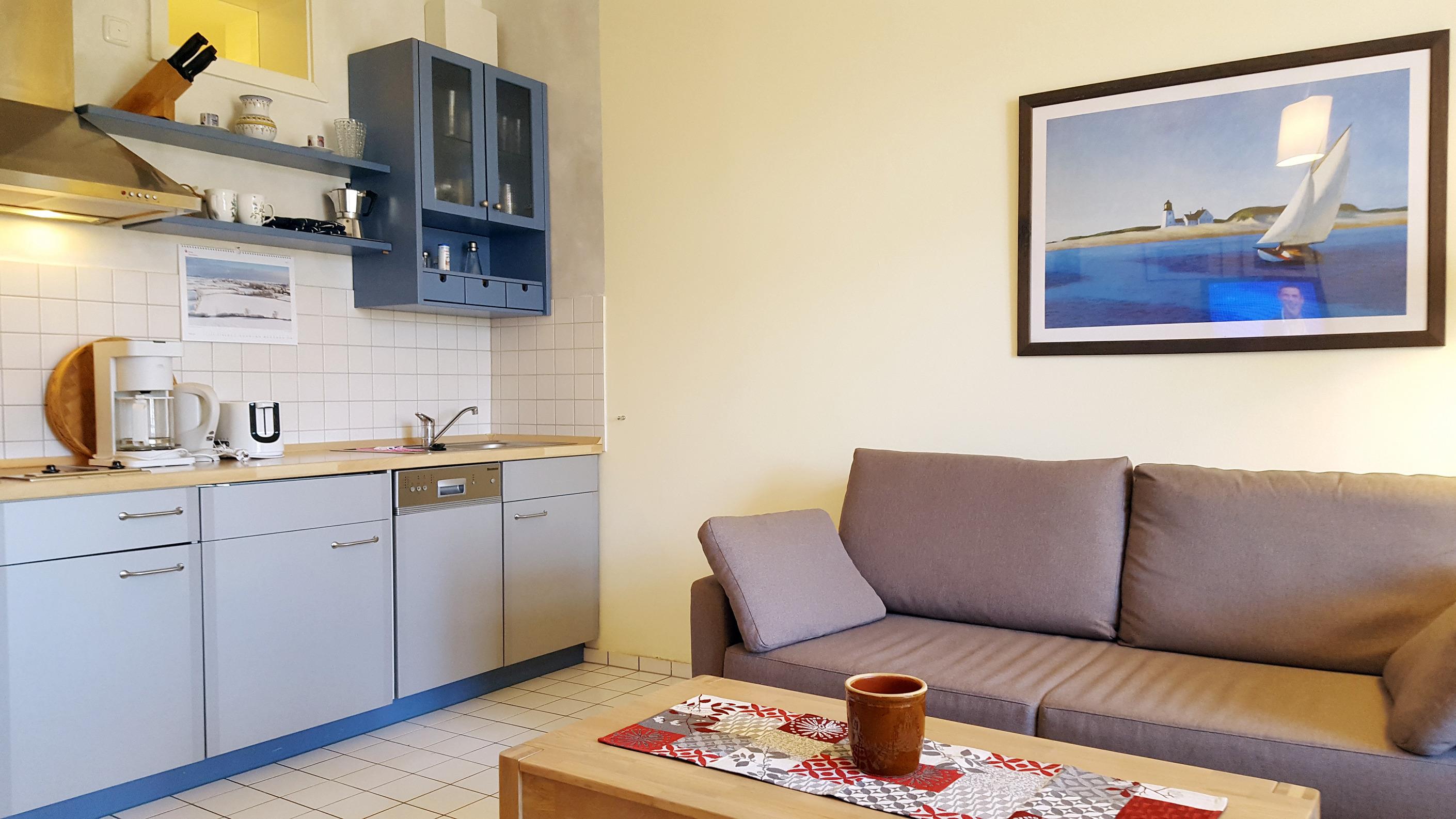 Der Wohnbereich ist eingerichtet mit einer Doppelschlafcouch mit Farb-TV, einer Pantryküche mit Geschirrspüler und einem Esstisch.