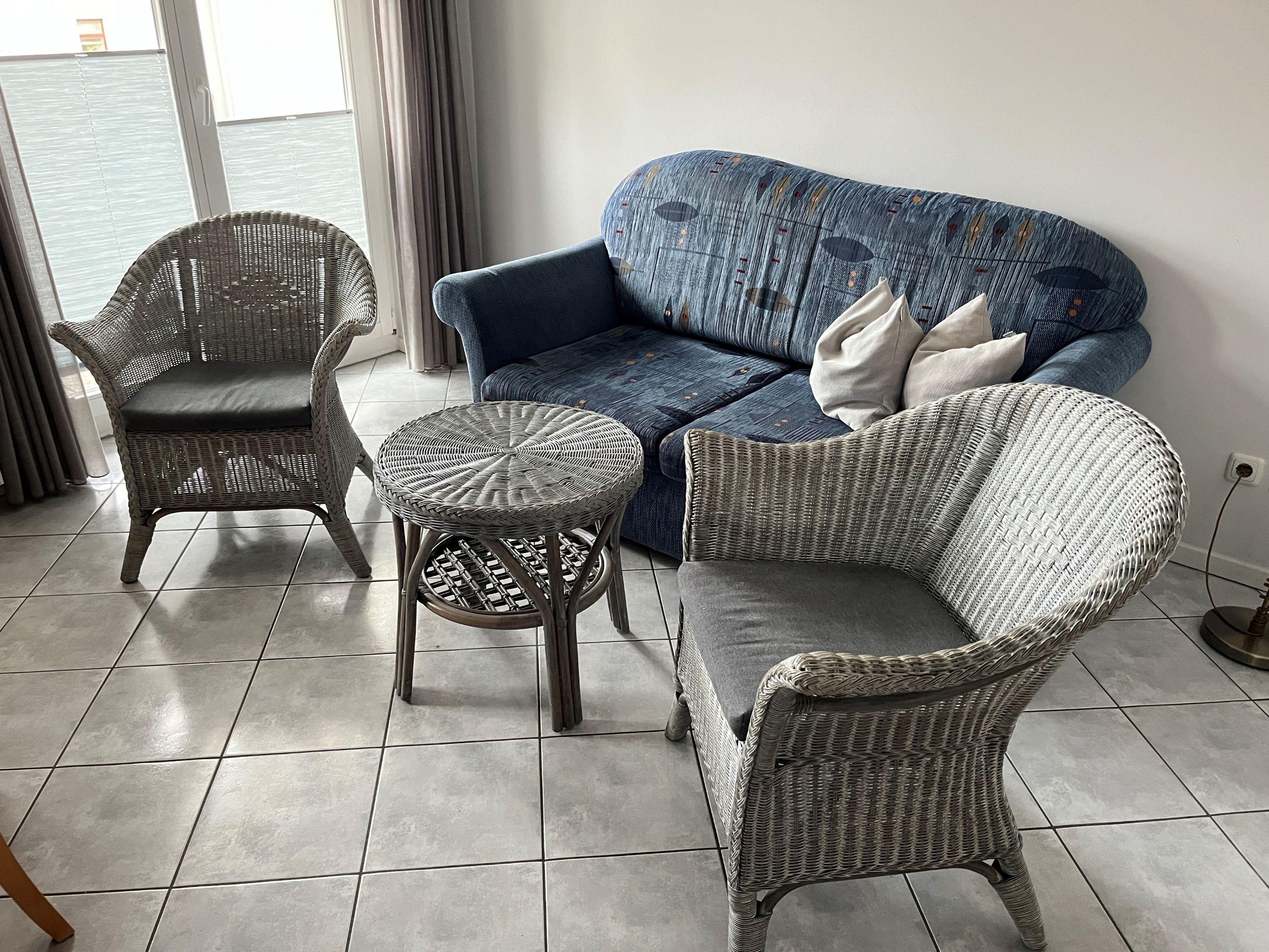Es erwartet Sie ein gemütlich eingerichteter Wohnbereich mit Sitzgruppe, Esstisch und integrierter Küchenzeile, die mit Ceran- Kochfeld, Backofen und Mikrowelle ausgestattet ist.