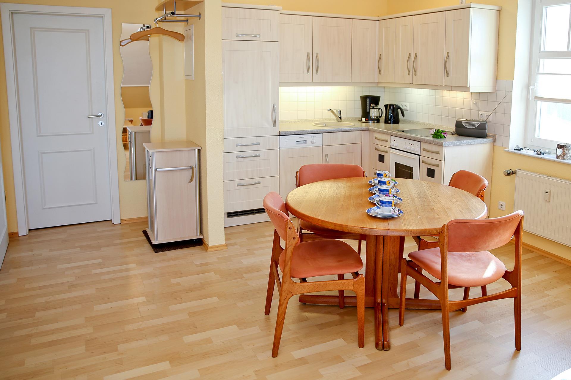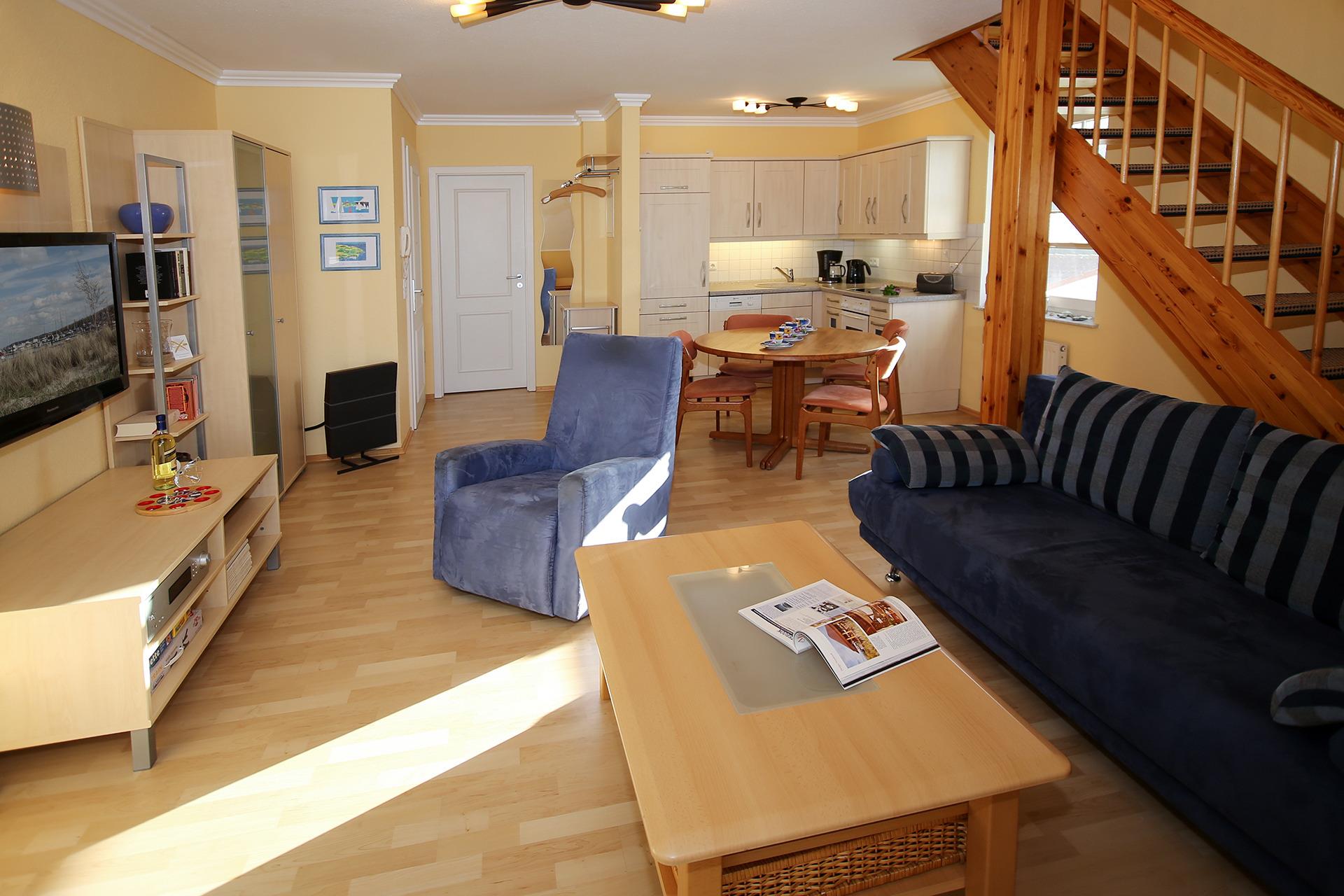 Die Wohnung ist auf ca. 45 m² eingerichtet mit einem Wohnzimmer mit Schlafcouch, Esstisch und Pantryküche mit Backofen, Herd und Geschirrspüler.