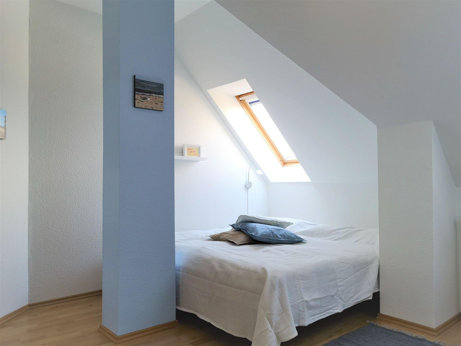 2 verdunkelbare Dachfenster lassen Sie in einem Doppelbett im Schlafzimmer von dem am Tag Erlebten träumen. Für Ihre Kleidung steht ein 3-türiger Kleiderschrank sowie eine Kommode bereit.
