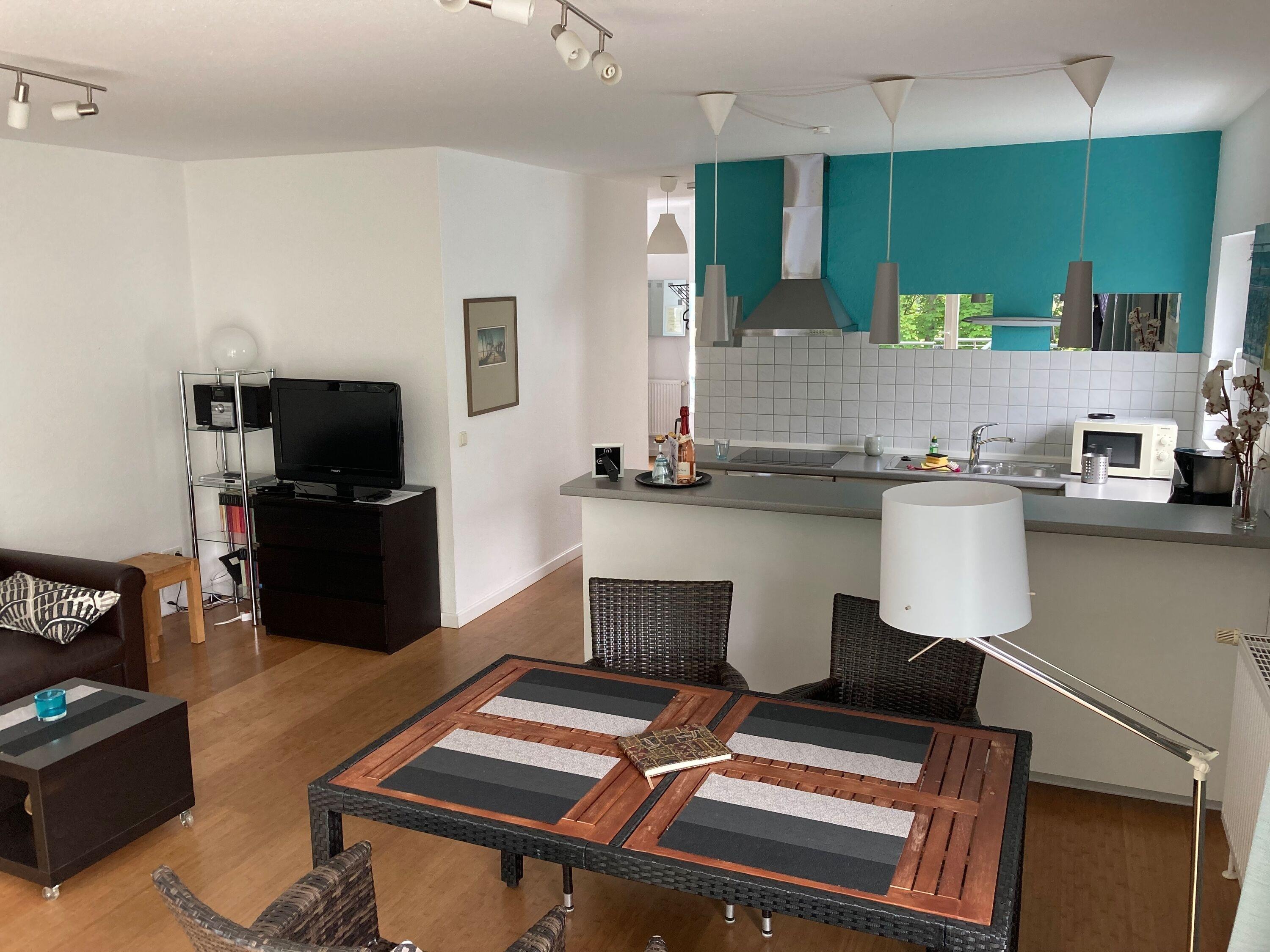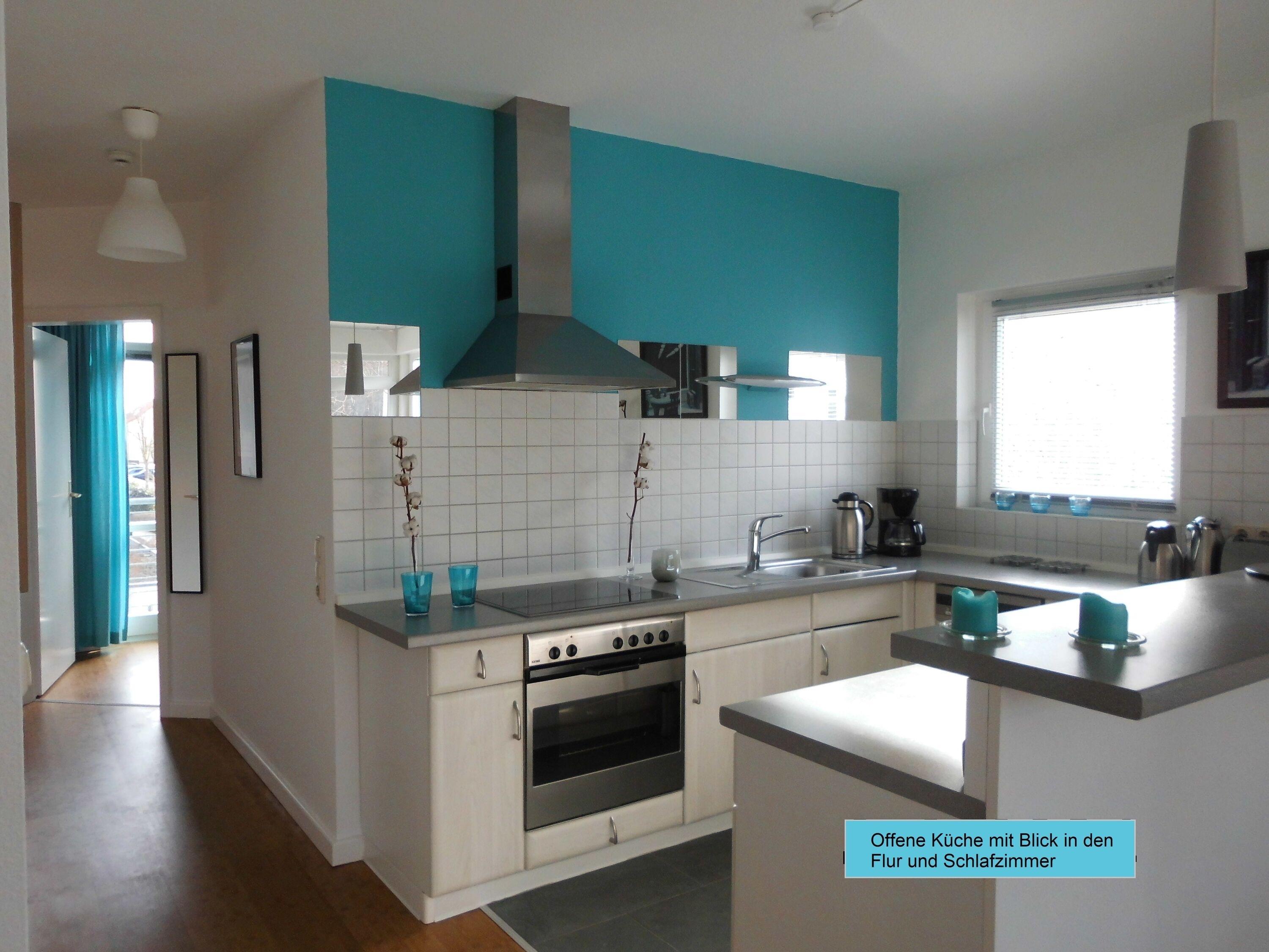 Die Ferienwohnung verfügt über eine komplett ausgestattete Küche, die in den großzügigen Wohnraum integriert ist.