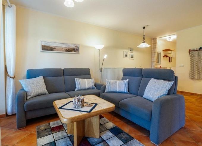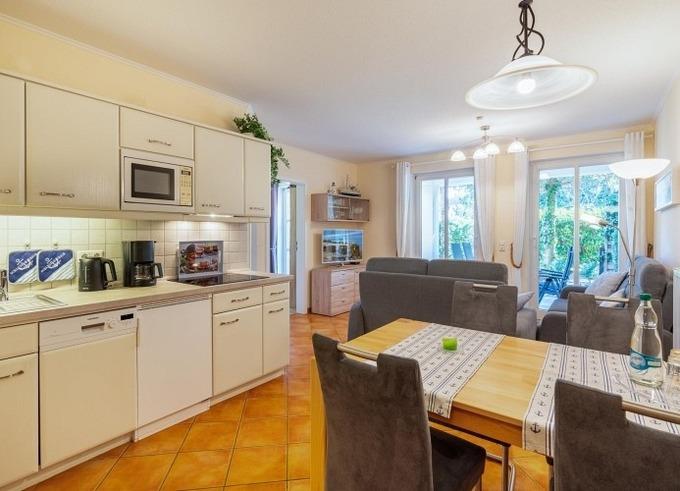 Im Wohnzimmer lädt eine gemütliche Sitzgruppe zum Verweilen und Relaxen ein. Für die entsprechende Entspannung sorgt der moderne Flachbild-Fernseher. Die Küche ist hochwertig ausgestattet und verfügt neben einem modernen Induktionsherd über eine Geschirrspülmaschine, einen Kühlschrank sowie über eine Mikrowelle.