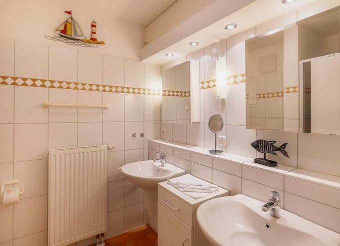 Das schöne Badezimmer mit Dusche, zwei Waschplätzen sowie WC runden das Angebot dieser schönen Ferienwohnung ab.