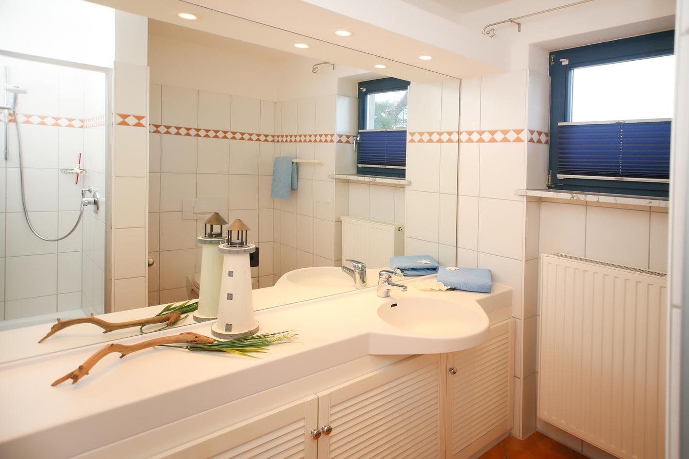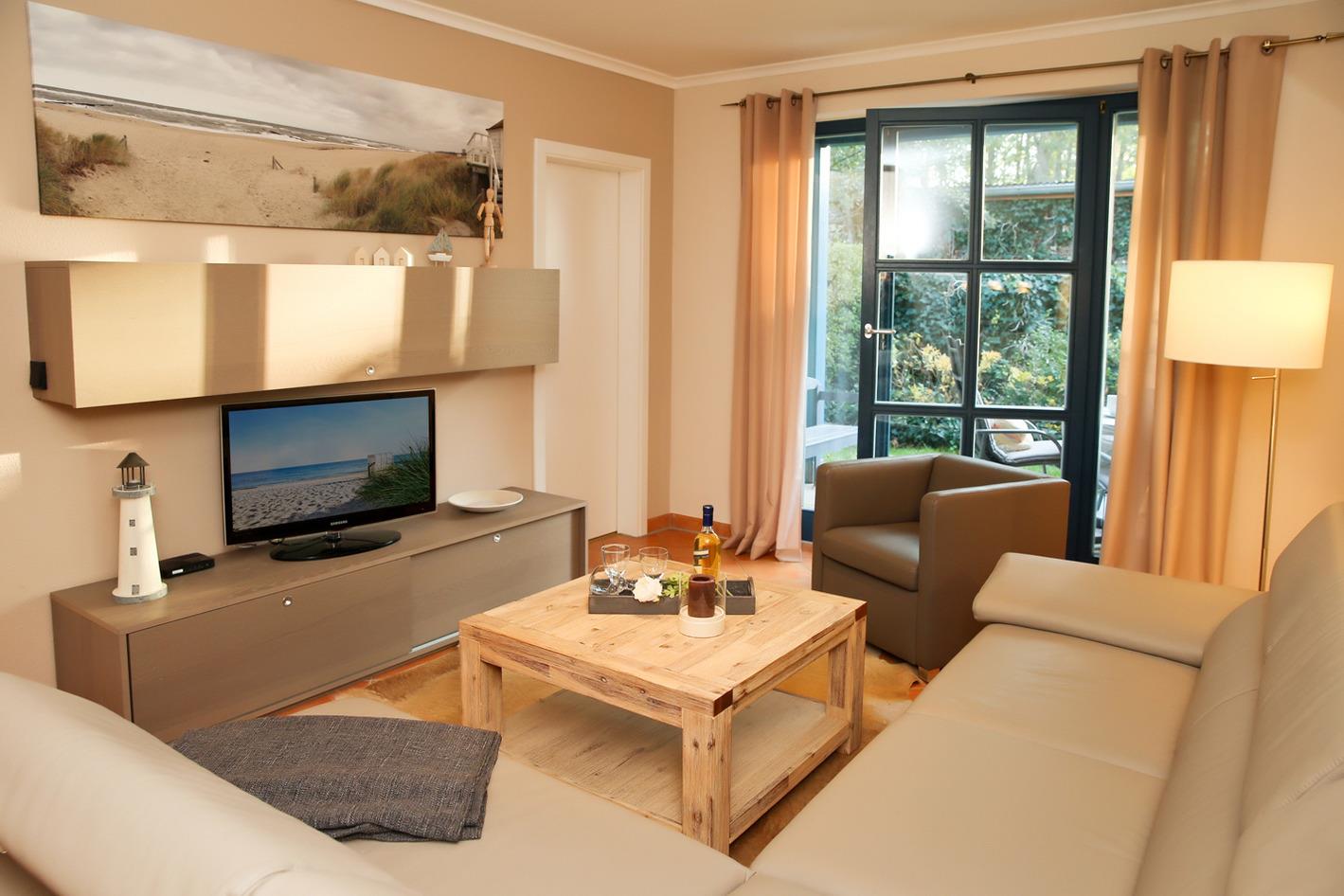 Die barrierearme, 3-Zimmer-Ferienwohnung, befindet sich im Erdgeschoss und ist ca. 54 m² groß. Sie bietet 2-4 Personen genügend Platz für einen angenehmen Aufenthalt. Im Wohn-und Essbereich befindet sich ein Loungesofa sowie ein Sessel. Die moderne Küchenzeile beinhaltet Geschirrspüler, Backofen, Microwelle und Kühlschrank und wird durch einen integrierten Esstisch vervollständigt.